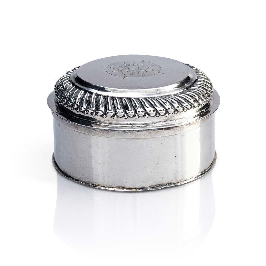 Avlång dosa av halvcylindrisk oval form med gångjärnslock, dekor av kransar i vit och svart taille dèpargne emalj, tumstycke i guld. Möjligen tillverkad i Moskva och senare stämplad i Stockholm. Ristat nr E61.