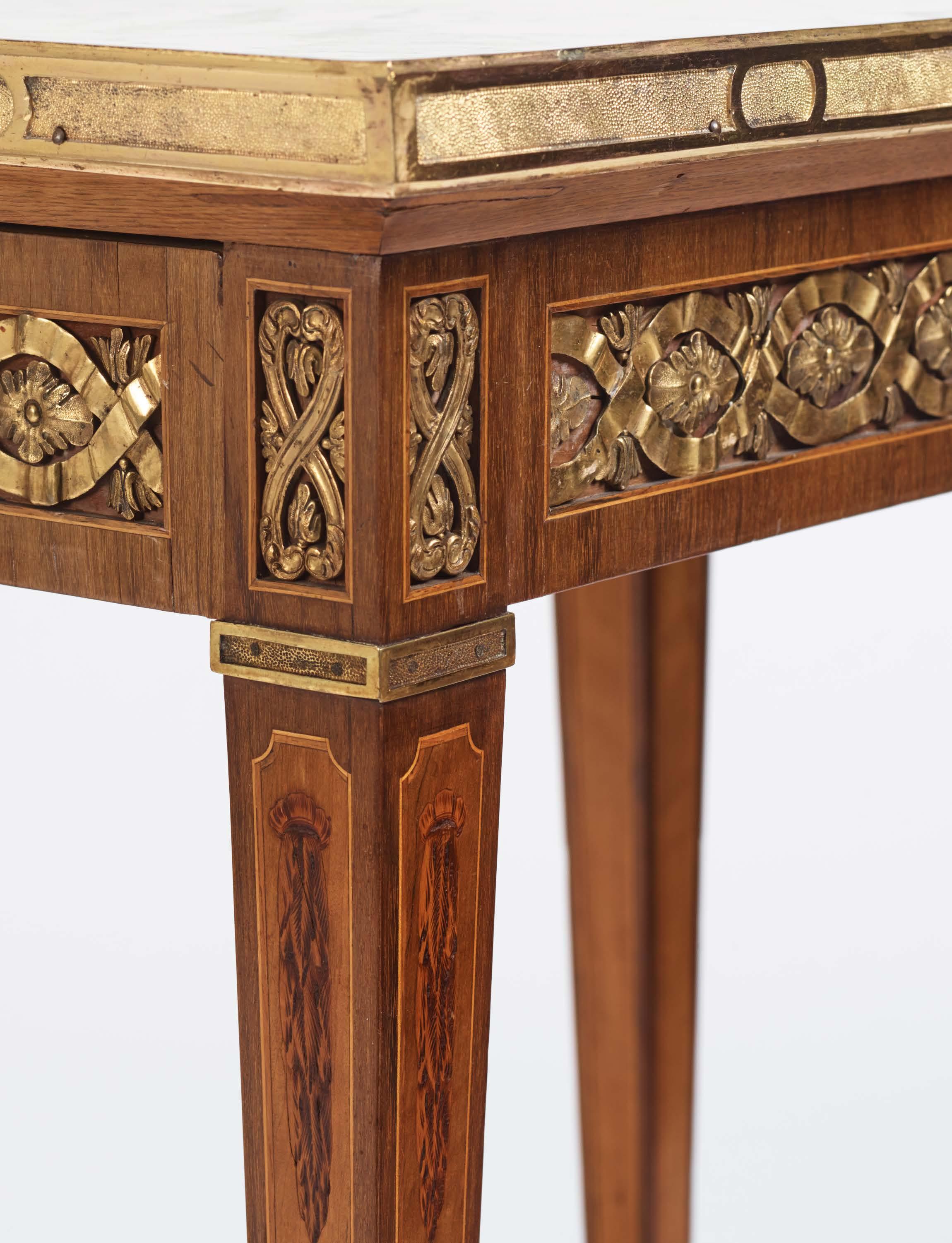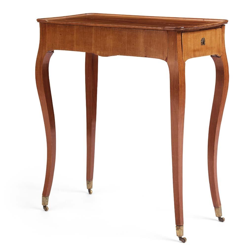 Fanerad med rosenträ, amarant, björk och färgat lövträ. Beslag och listverk av förgylld mässing. Rak form med mittrisalit, snedställda hörn och cabrioletsvängda ben. Samkomponerad front med inläggningar av lagergirlander, bandrosetter samt blomstermedaljong. Tre lådor. Skiva av röd kalksten. Märkt med Stockholms snickarämbetes stämpel i översta lådan. Längd 86, bredd 49, höjd 82 cm. Nyckel medföljer. Ej signerad.