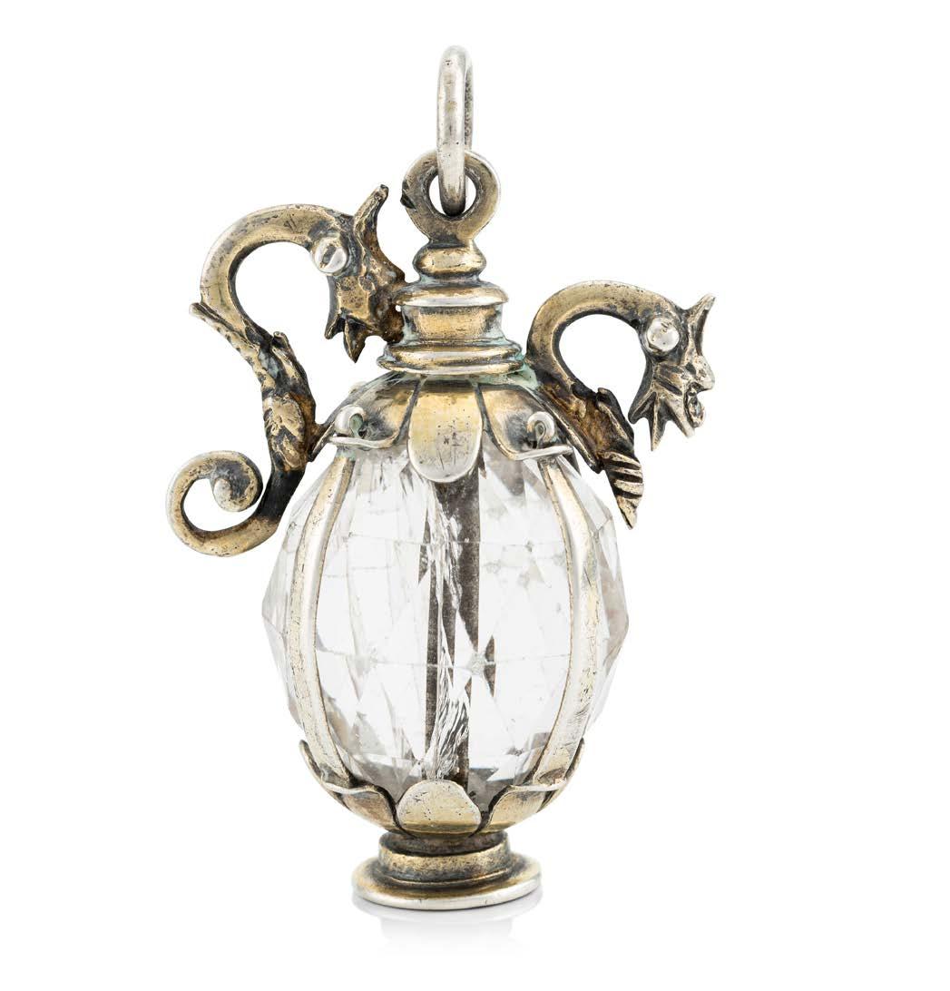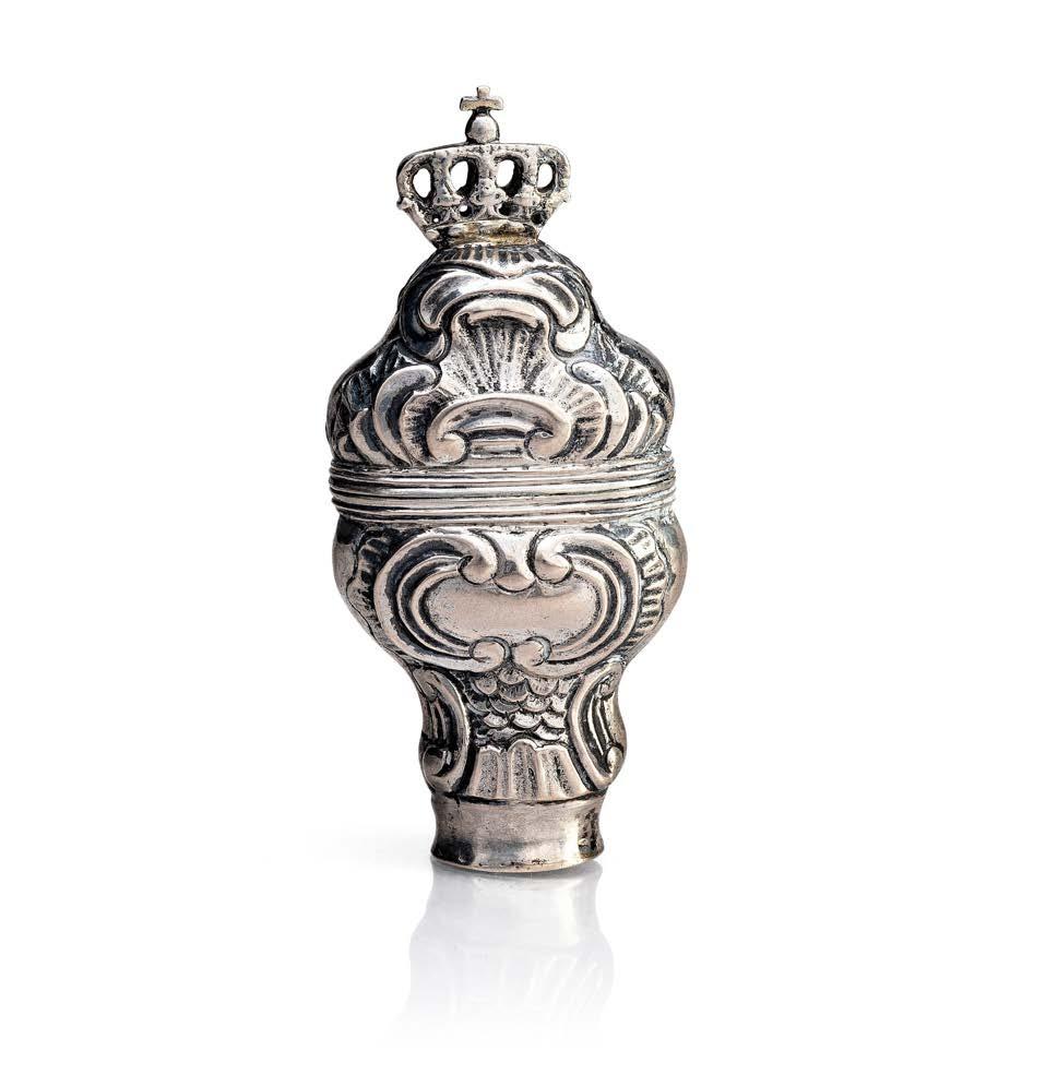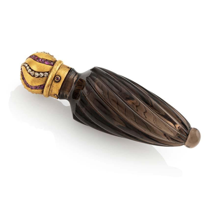 471. Flacon, rökkvarts, locket i 14K guld med rubiner och rosenslipade diamanter, C.E. Bolin, Moskva 1890-tal. Skuren ur en enda bit rökkvarts. Längd 7,8 cm. Originaletui medföljer.