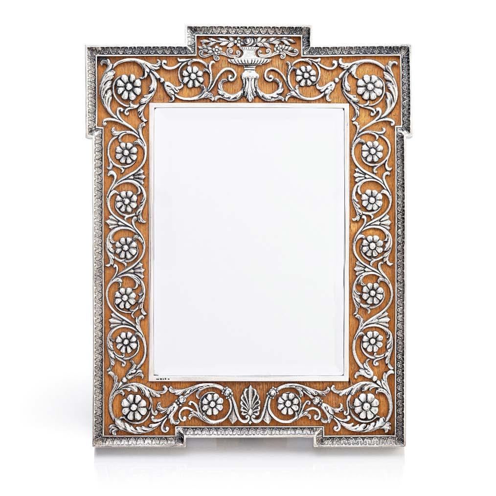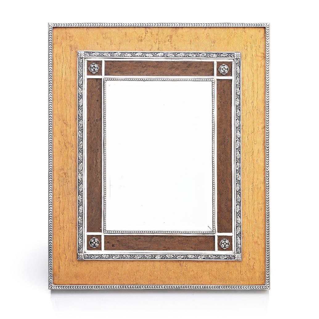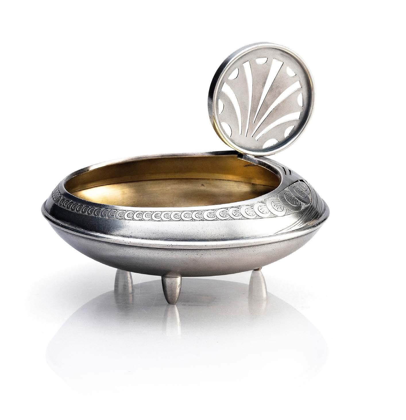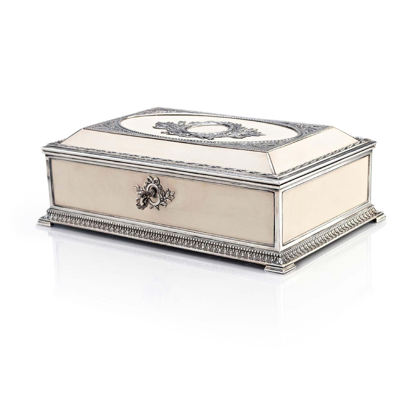 Rektangulär form med rundade hörn, ytan med ett graverat romboidmönster med rosenslipade diamanter, insidan av förgylld silver och låset med cabochonslipad safir. Ristat inventarienummer 6928. I en originalmonterad läderfodral märkt C.E. Bolin med kejserlig örn. Höjd 1 cm, bredd 4,8 cm, längd 8,4 cm. Vikt 96 g.