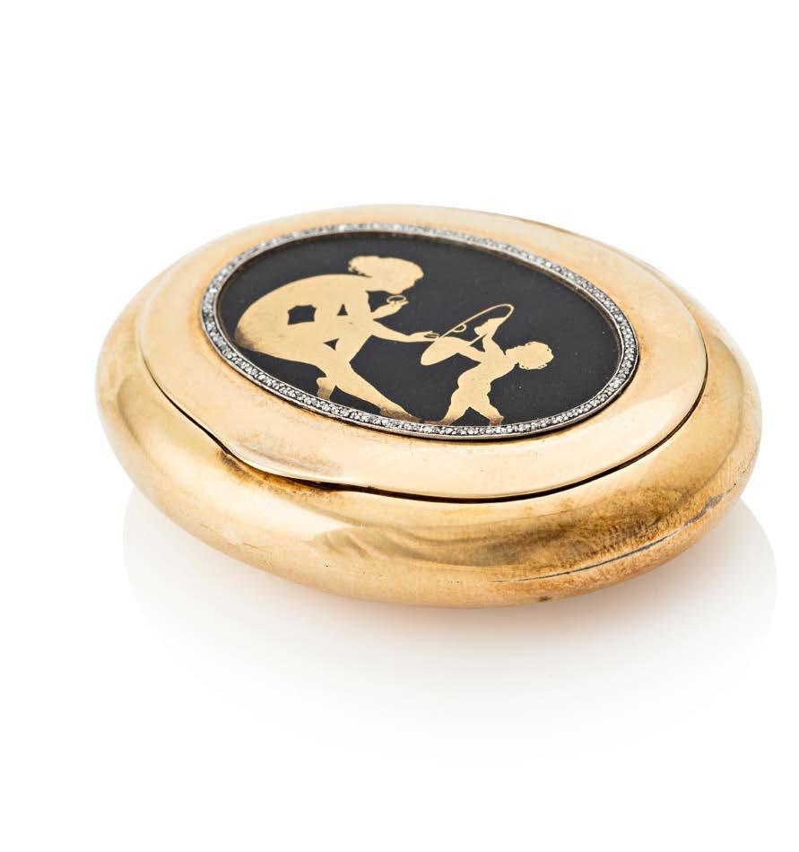 Oval form, i mitten av locket en scen i polerat guld mot en bakgrund av svart matterad opak emalj, föreställande en dam framför en spegel som hålls av en amor i art déco-stil. Scenen omgärdad av rosenslipade diamanter. Senare märkt W.A. Bolin, Stockholm 1919. Inuti locket finns en spegel. Original etui medföljer. Höjd 1,3 cm. Bredd 4 cm. Längd 5,2 cm. Vikt: 35,4 g.