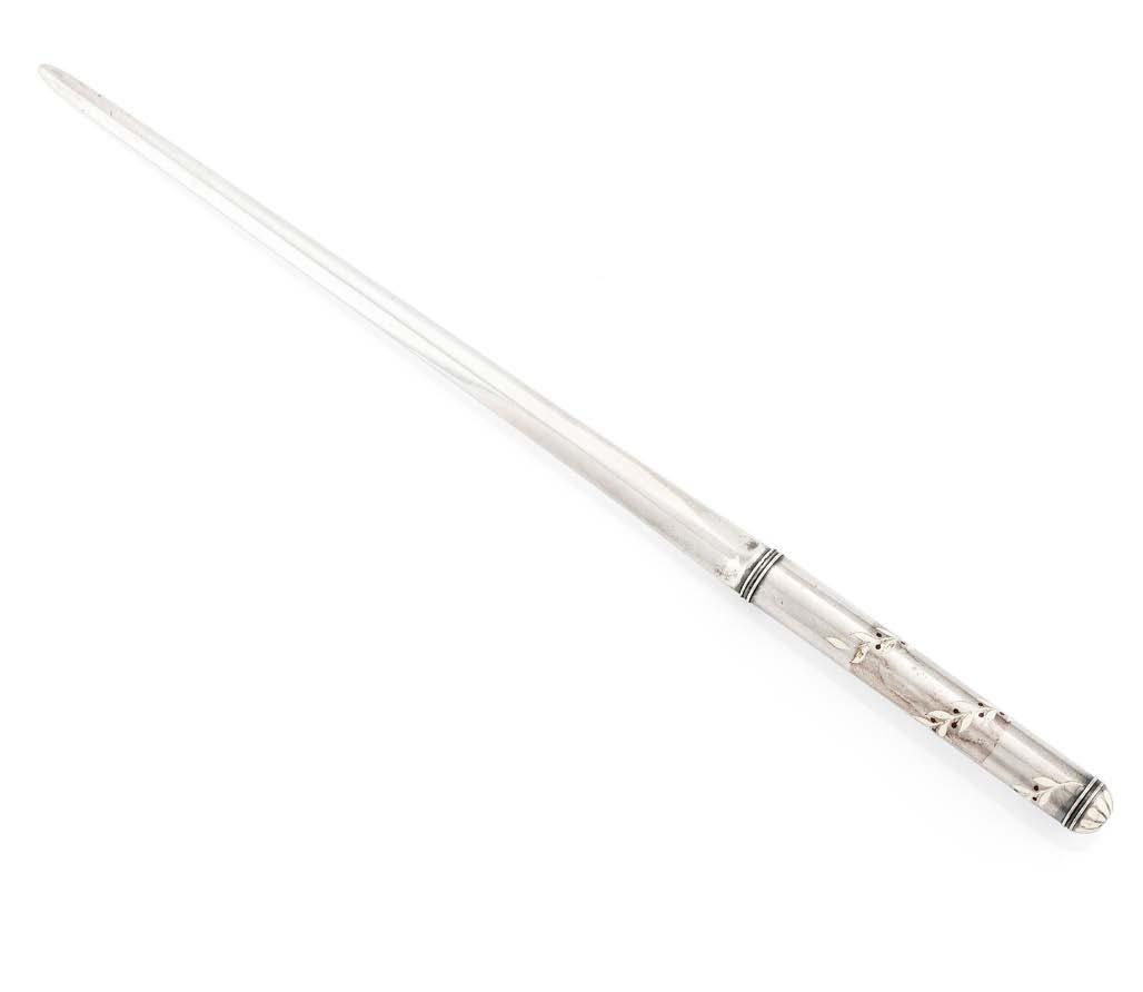 475. Brevkniv, silver och emalj, W.A. Bolin, Stockholm 1919. Runt skaft med dekor av lagerranka i vit och röd emalj champlevé. Längd 23,5 cm. Vikt 39 g.