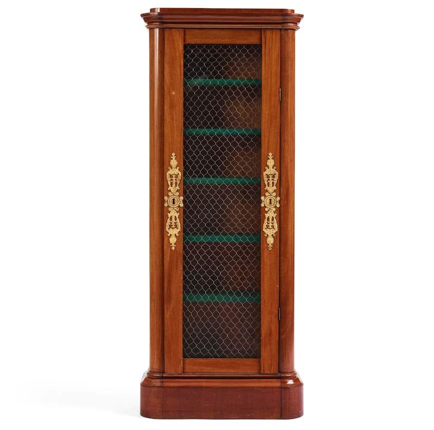 5. Bokskåp, Stockholmsarbete, tidigt 1800-tal, Empire. Mahogny samt mahognyfaner. Beslag av förgylld brons. Glasad ”grille”-dörr med flätad mässingstråd och bakomvarande hyllinredning. Längd 51, bredd 26,5, höjd 126,5 cm. Nyckel medföljer.