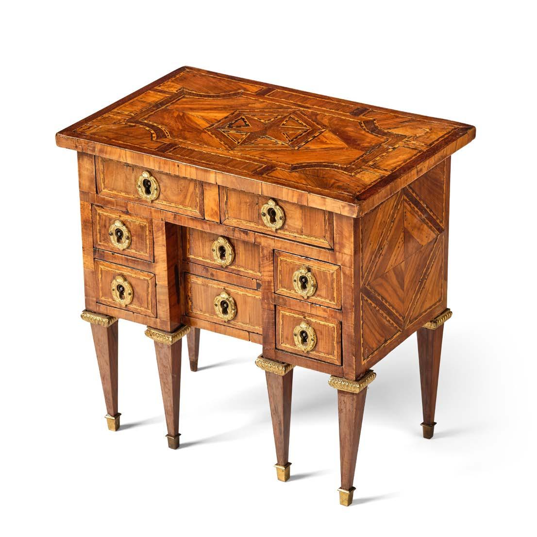 Fanerad med alrot och alm. Beslag av förgylld mässing. Uppsats med sex lådor samt ett skåpfack. Därunder tolv lådor, varav en med dold låsmekanik, samt ett skåpfack. Längd 126, bredd 61, skivans höjd 84, höjd 102. Två nycklar medföljer.