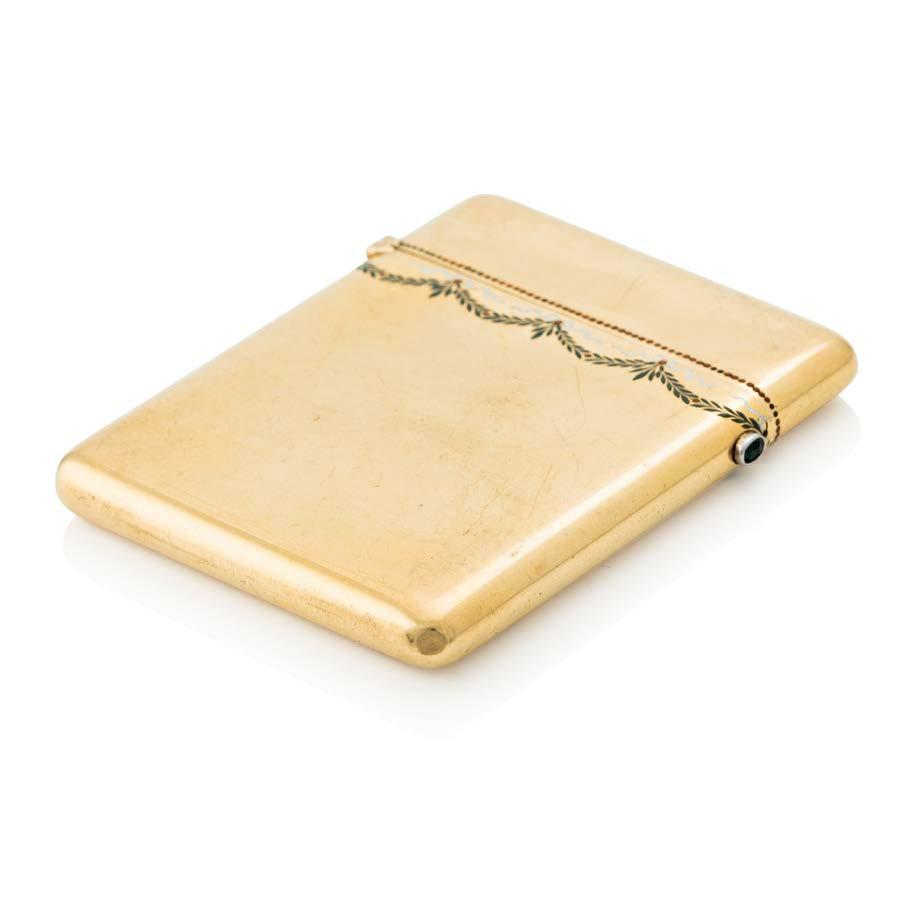480. Visitkortsetui, 18K guld med emalj och smaragd, W.A. Bolin, Stockholm 1919.