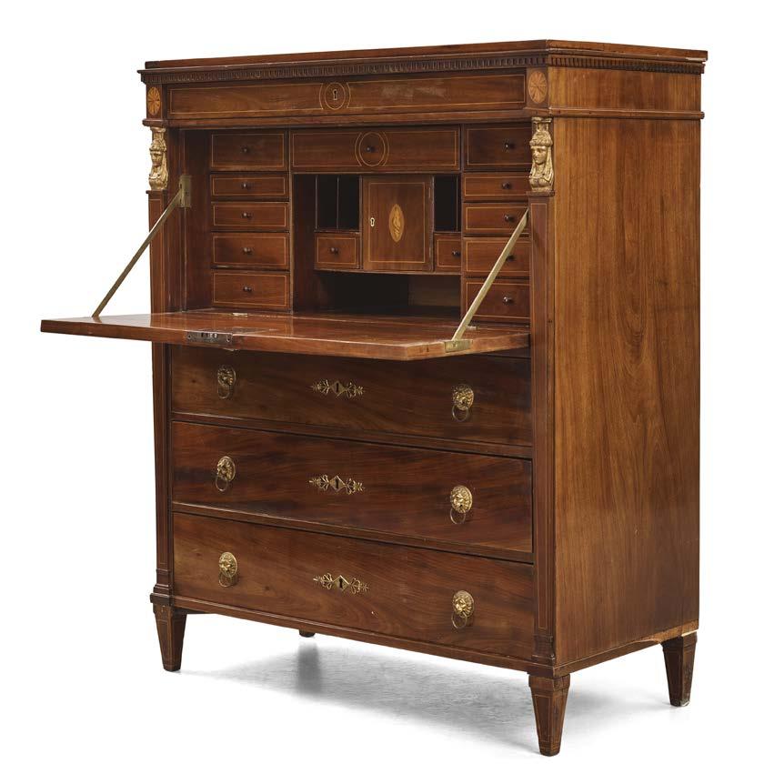 Mahogny, mahognyfaner, lönn, samt eboniserat trä. Rik beslagsornamentik av förgylld brons. Rakt krön med dekor av tandsnitt, beslag i form av lyrspelande Sappho signerade ”E”, utförda av Carl Enhörning (medaljgravör verksam i Stockholm 1788-1821), ovan glasade pardörrar med dekor av flankerande hermer, bakomvarande inredning av nitton lådor, sidorna med bärhandtag, nederdel med klaff inneslutandes skrivskiva, ovan konkava skåpdörrar med bakomvarande hyllinredning, avslutande lejontassar med hjultrissor. Längd 126,5, bredd 67, höjd 191 cm. Nyckel medföljer.