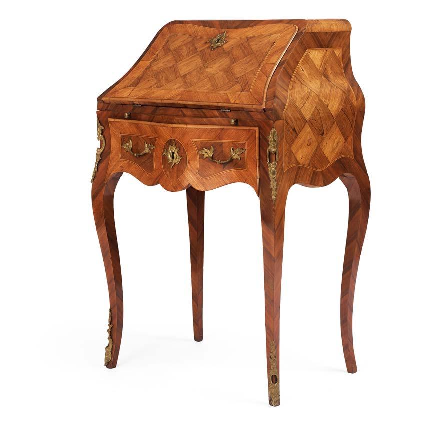 Fanerad med kungsträ i parkettläggning. Beslag av förgylld brons. Lätt svängd bukig form. Fyra lådor i två lådvarv. Skiva av röd kalksten. Längd 130, bredd 57,5, höjd 85,5 cm Nyckel medföljer.