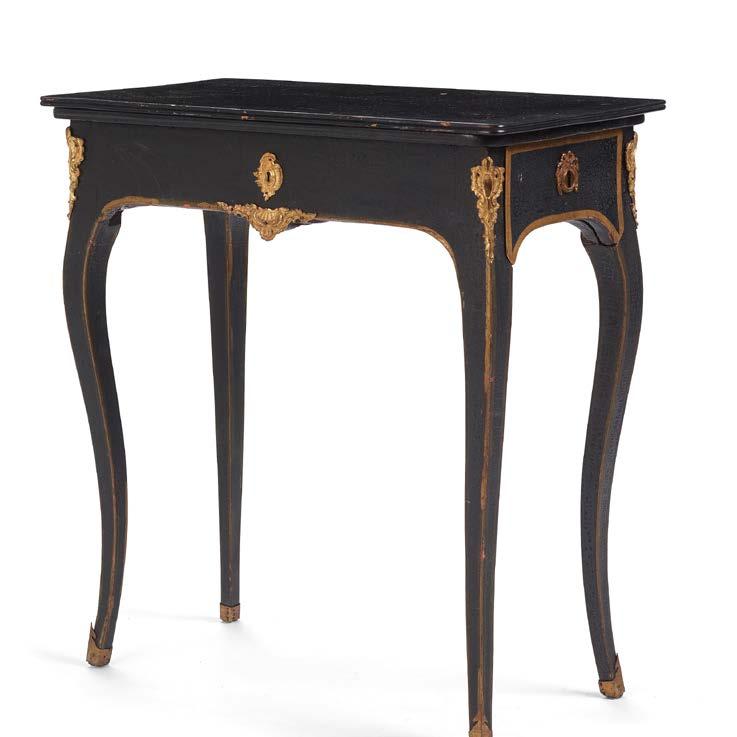 Fanerad med jakaranda och amarant med ådror av lönn. Inläggningar i fält. Beslag och listverk av förgylld mässing. Tre lådor. Snäpplås. Svartlackerad skiva. Längd 99, bredd 54, höjd 85 cm. Nyckel medföljer.