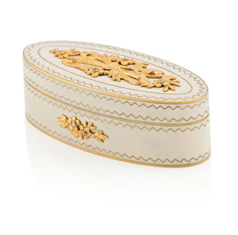 479. Dosa, 18K guld, diamanter och vit opak emalj. W.A. Bolin Moskva 1912-1917.