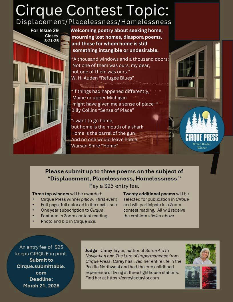 Cirque invites emerging and established writers living in the North Pacific Rim—Alaska, Washington, Oregon, Idaho, Montana, Hawaii, Yukon Territory, Alberta, British Columbia and Chukotka—to submit short stories, poems, creative nonfiction, translations, plays, reviews of first books, interviews, photographs, and artwork for Cirque’s next issue.