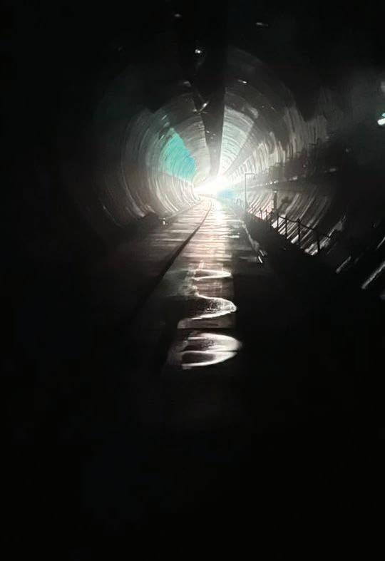 to advance into the mountain. Immediately after the head has moved forward, the cutter covers the living rock of the tunnel with a succession of rings: 8 segments of tunnel lining in reinforced concrete that assure the tunnel’s stability. Ten attached trailers will transport the extracted rock by conveyor belt to the surface.