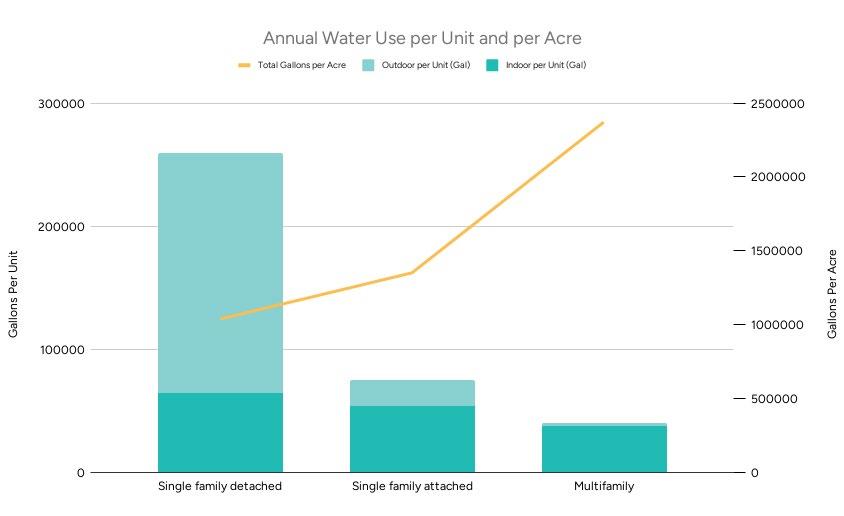 • In certain submarkets, local plans seek to align land use planning with water availability. In other words, cities plan for the number of units that can be supported by estimates of water supply, making planned capacity a loose proxy for water capacity. Water use per unit is a critical assumption for this type of planning.
