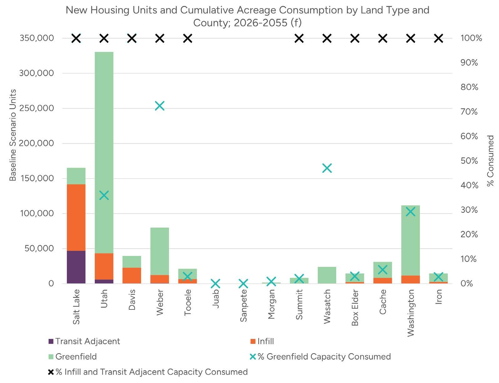 • In all study areas, 3% of vacant and redevelopment land is infill, which accommodates 24% of new housing units in the baseline scenario (5% of land and 27% of units in the Wasatch Front).