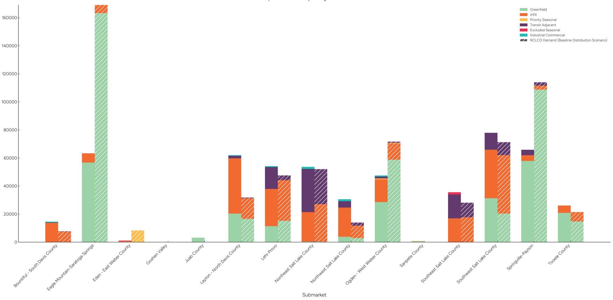 • Submarkets containing greenfield areas essential to supporting future growth under the baseline distribution model (Eagle Mountain-Saratoga Springs, Springville-Payson, Iron County, and Washington County submarkets) do not have documented planned capacity sufficient to meet future housing demand from the baseline distribution model.