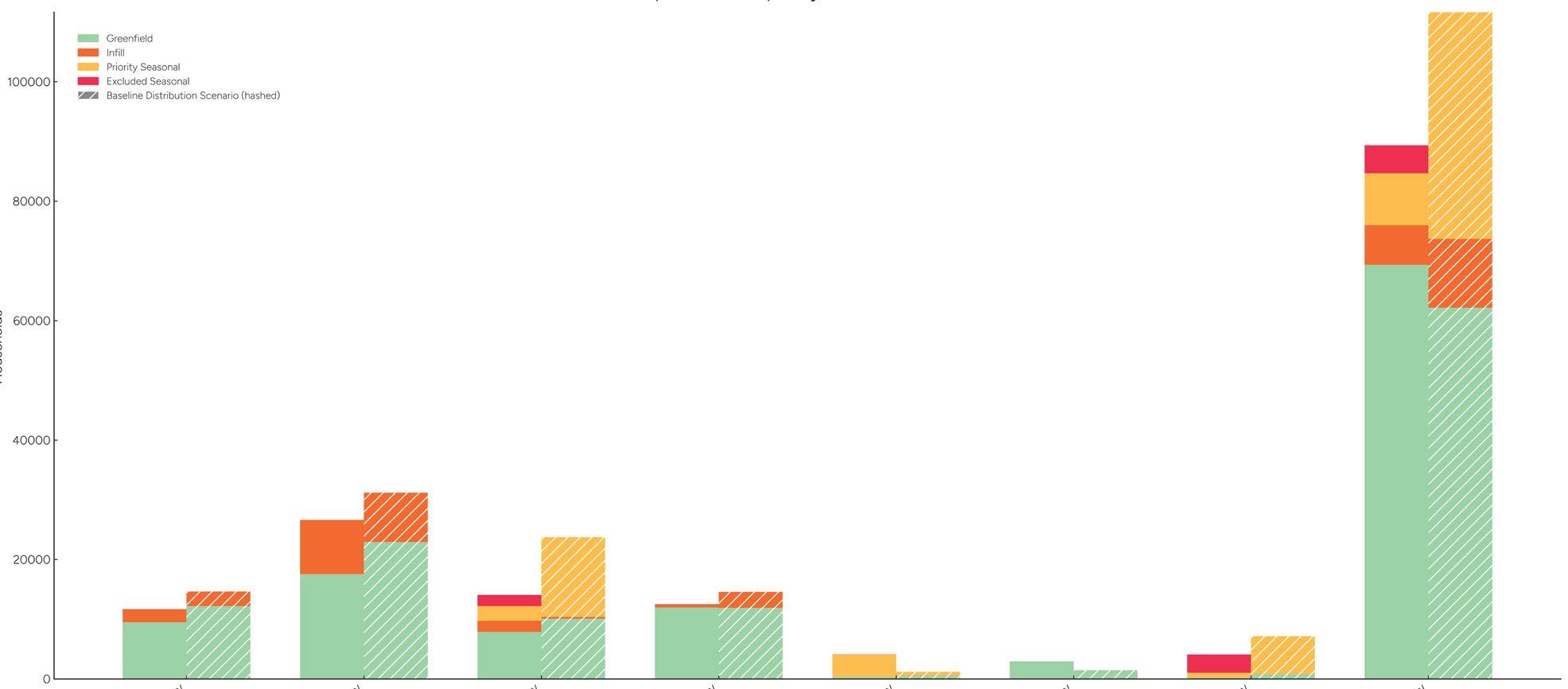The baseline distribution scenario distributes more housing demand to greenfield-dominant markets including Utah County and Weber County and less to infill markets including Salt Lake County and Davis County than the Gardner Institute’s demographic projections, which are not constrained by land availability.
