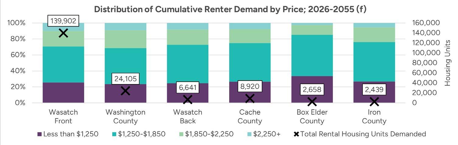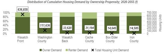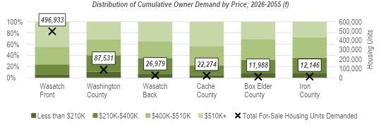 The Wasatch Front accounts for three quarters of future housing demand and commands higher prices and densities than other parts of the state, reflecting its role as the state’s primary economic engine. Washington County has the second highest demand for total units, while Cache County emerges as a secondary market for