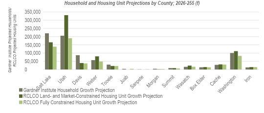 • The difference between Gardner Institute household projections and fully constrained housing unit distribution are most significant in Salt Lake County (81,000), Davis County (50,000), and Washington County (18,000).
