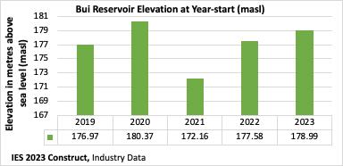 Data from Akosombo and Bui hydro-electric generating stations (GS) indicate elevations at the beginning of 2023 are in a better positions to produce more electricity than the thermals, compared to previous years. Bui's water elevation is expected to help produce more megawatts to meet increasing electricity demand at particularly peak hours, and extended mega Vars to support voltage on the grid and help reduce transmission losses, if dispatched conservatively throughout the year.