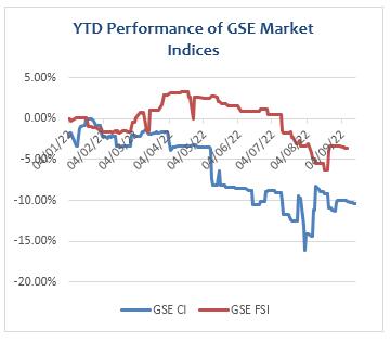 The Ghana Stock Exchange closed lower for the second consecutive week on the back of price declines by 7 counters The GSE Composite Index (GSE CI) lost 8 49 year-to-date (YTD) loss of 10 38%. The GSE Financial Stocks Index (GSE FI) also lost 5 52 points (-0 27%) to Market capitalization declined by 0 13% to close the YTD decrease of 0 15%. preceding week