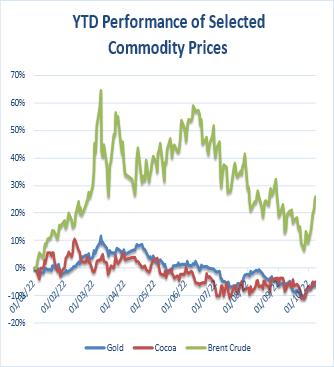 Prices of Cocoa increased for the week. The commodity traded at US$2,396.00 per tonne on Friday, from US$2,354.00 last week, reflecting w/w gain and YTD loss of 1.78% and 4.92% respectively.