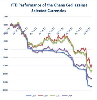 The Cedi also weakened against the GBP for the week. It traded at GH¢10.7034/£, compared with GH¢10.7017/£ at week open, reflecting w/w and YTD depreciations of 0.02% and 24.07% respectively. This compares with YTD depreciation of 1.68% a year ago.