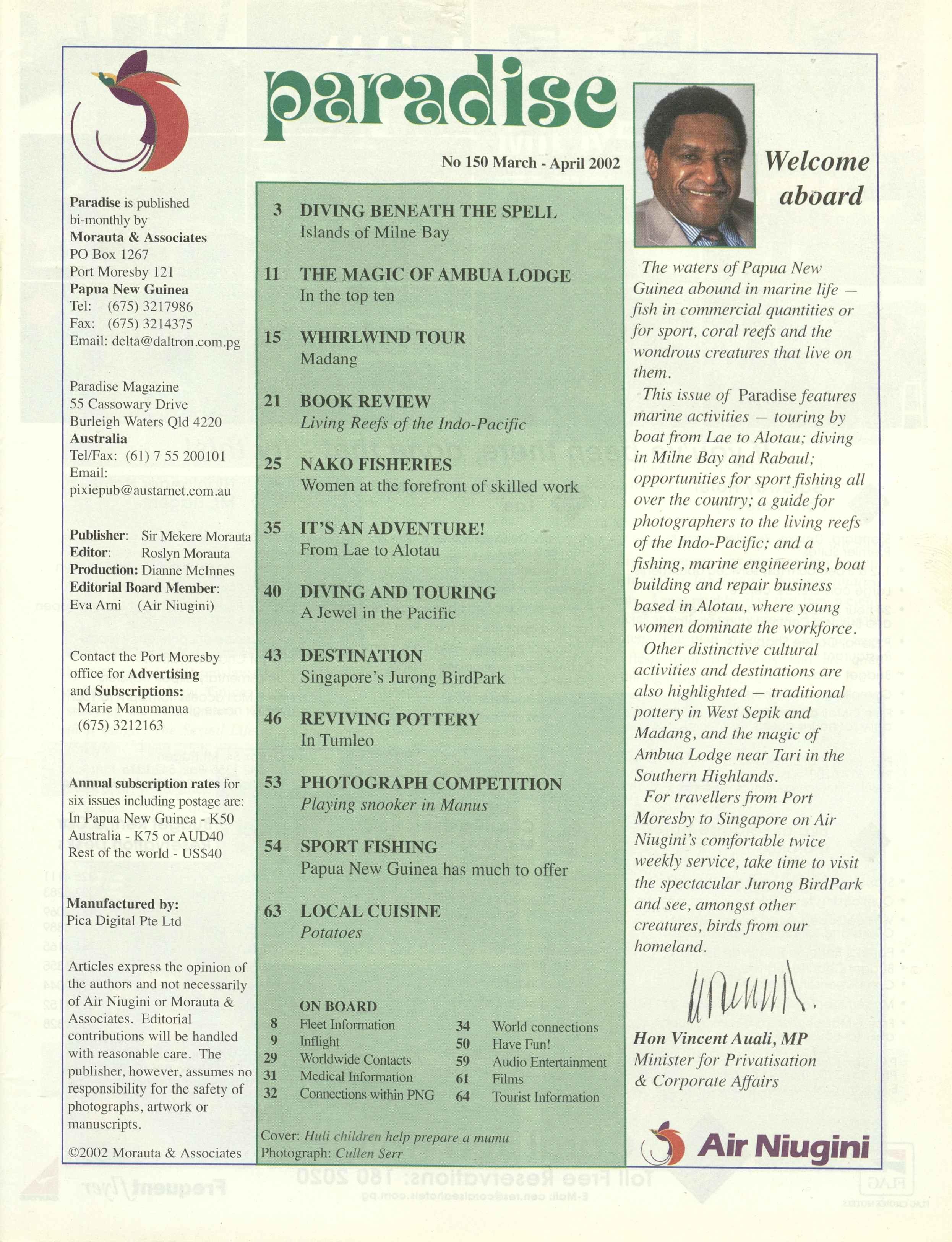 Issue 150 March 2002 of Paradise magazine, the inflight magazine of Air Niugini, the national airline of Papua New Guinea.