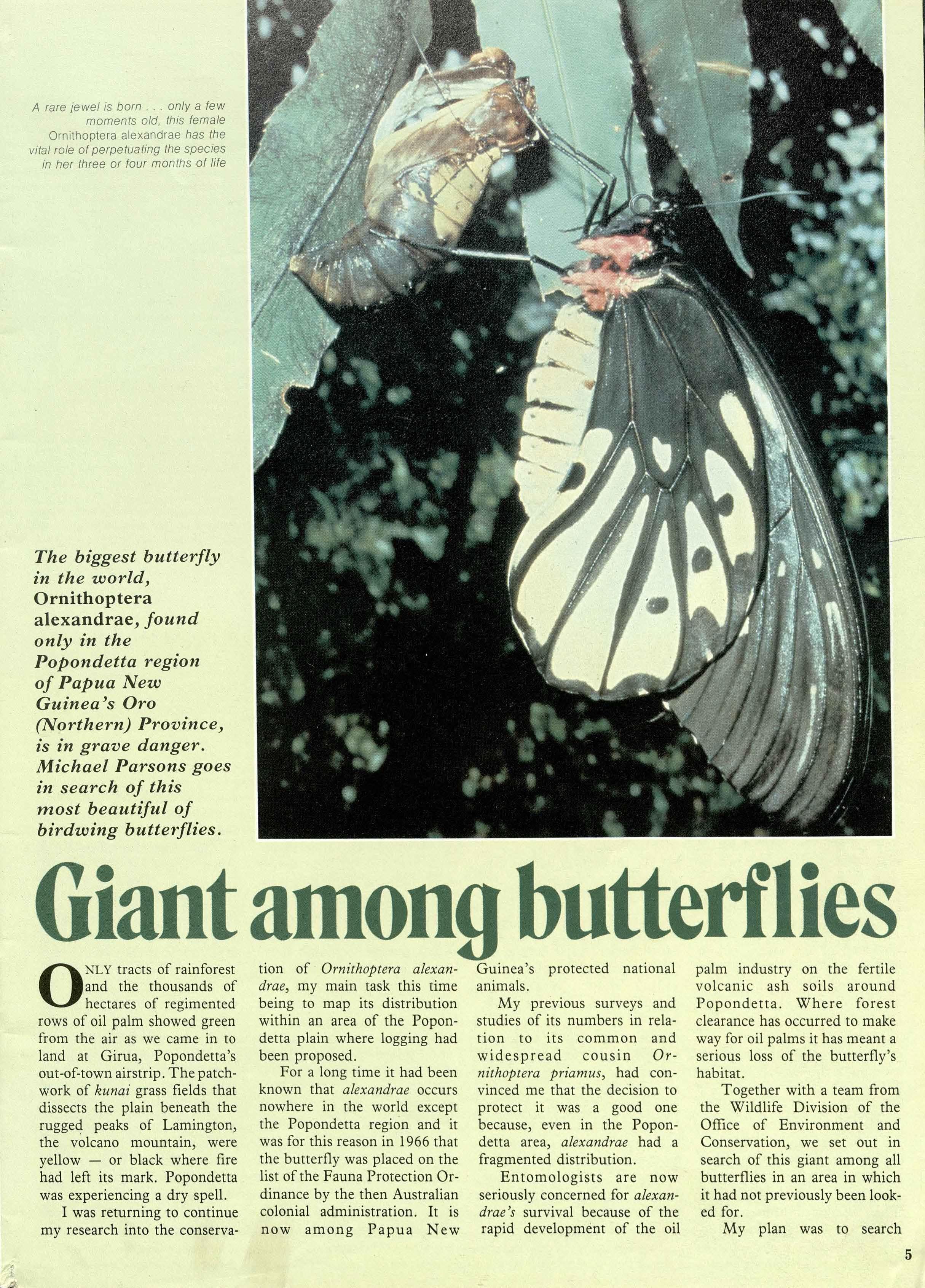 Other land is being designated wildlife management areas, having been set aside specifically to conserve and study alexandrae at the request of traditional owners, people who realise that the butterfly is an important heritage of the people of Papua New Guinea which must be preserved for generations to come.Michael Parsons works with the Insect Farming and Trading Agency of the Division of Wildlife at Bulolo in Morobe Province.~