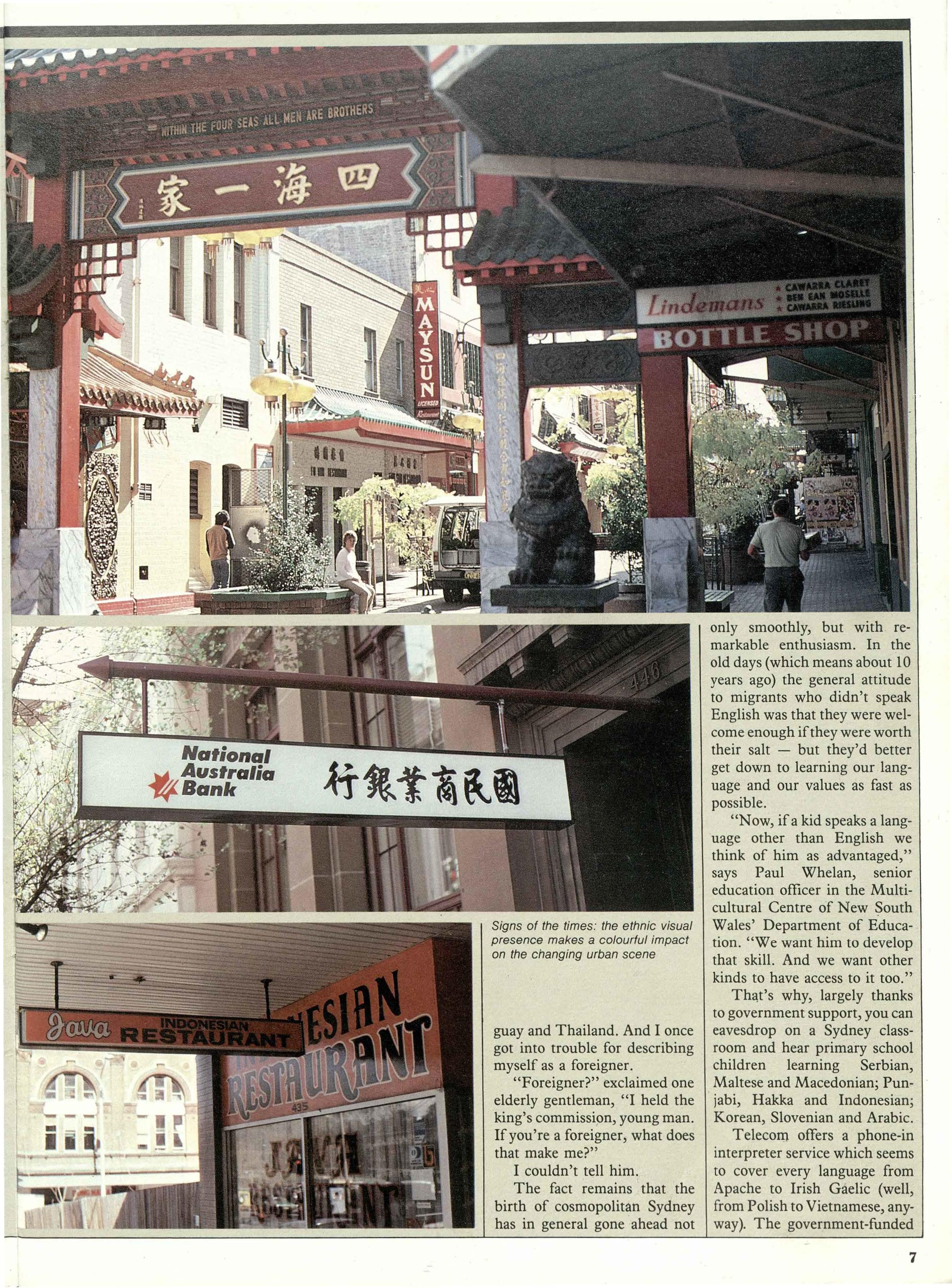 Where there's language, there's culture. Even the most casual visitor to Sydney is unfortunate if he doesn't stumble across some ethnic event or other. Every week or so something is happening.