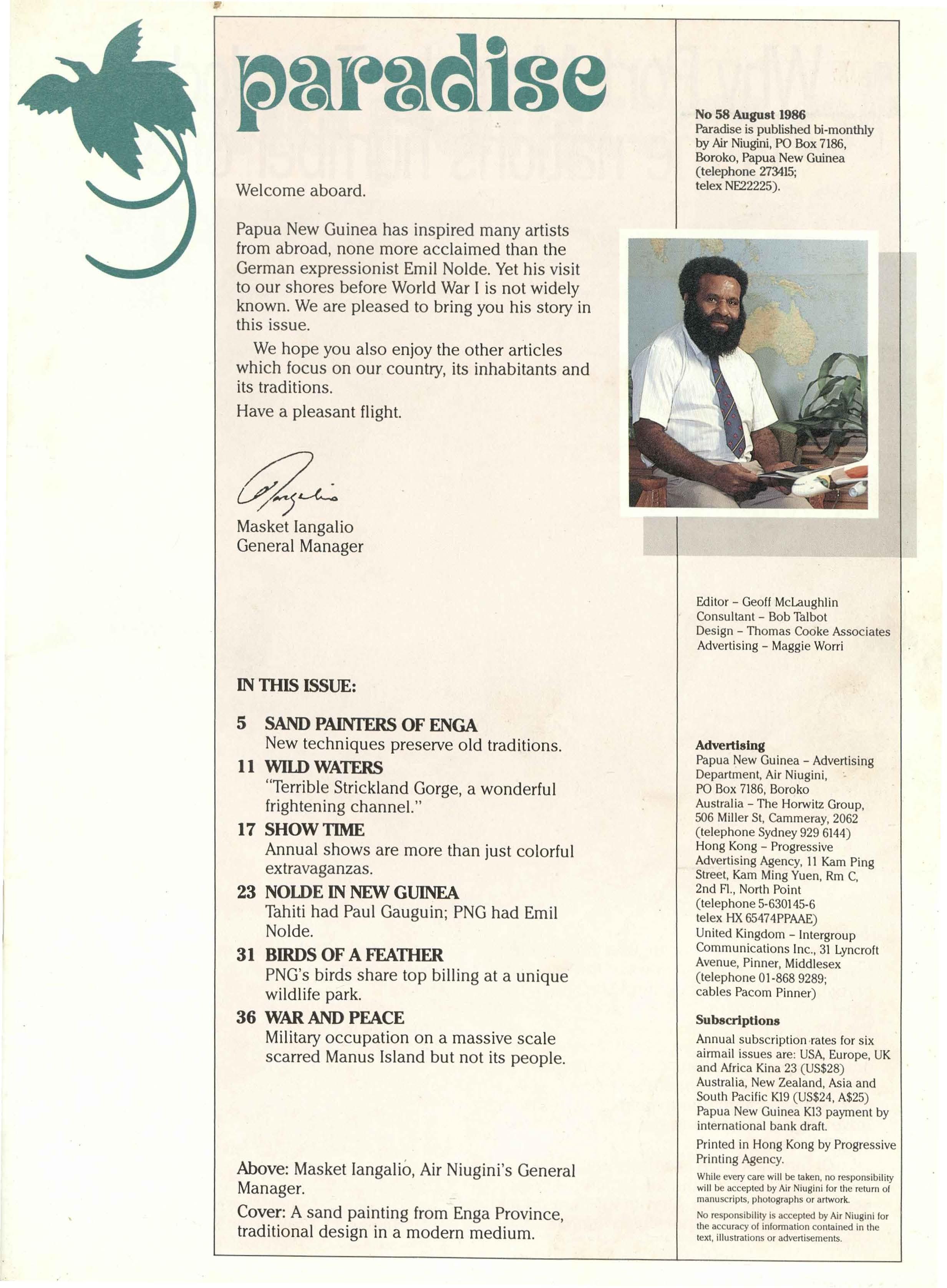 Paradise is published bi-monthly by Air Niugini, PO Box 7186, Boroko, Papua New Guinea (telephone 273415; telex NF22225).
