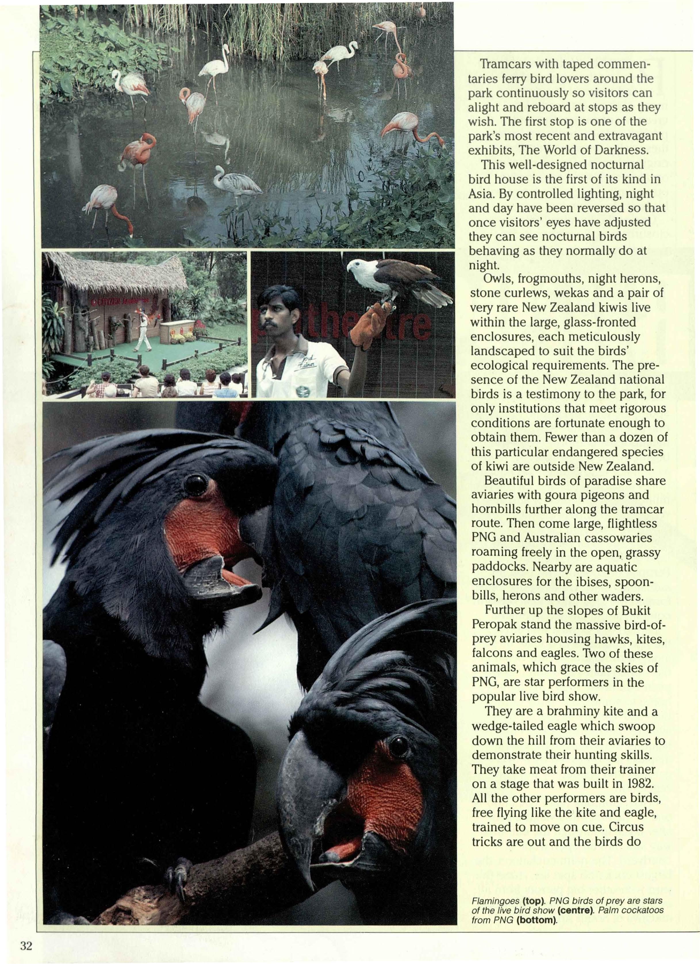 Further up the slopes of Bukit Peropak stand the massive bird-ofprey aviaries housing hawks, kites, falcons and eagles. Two of these animals, which grace the skies of PNG, are star performers in the popular live bird show.