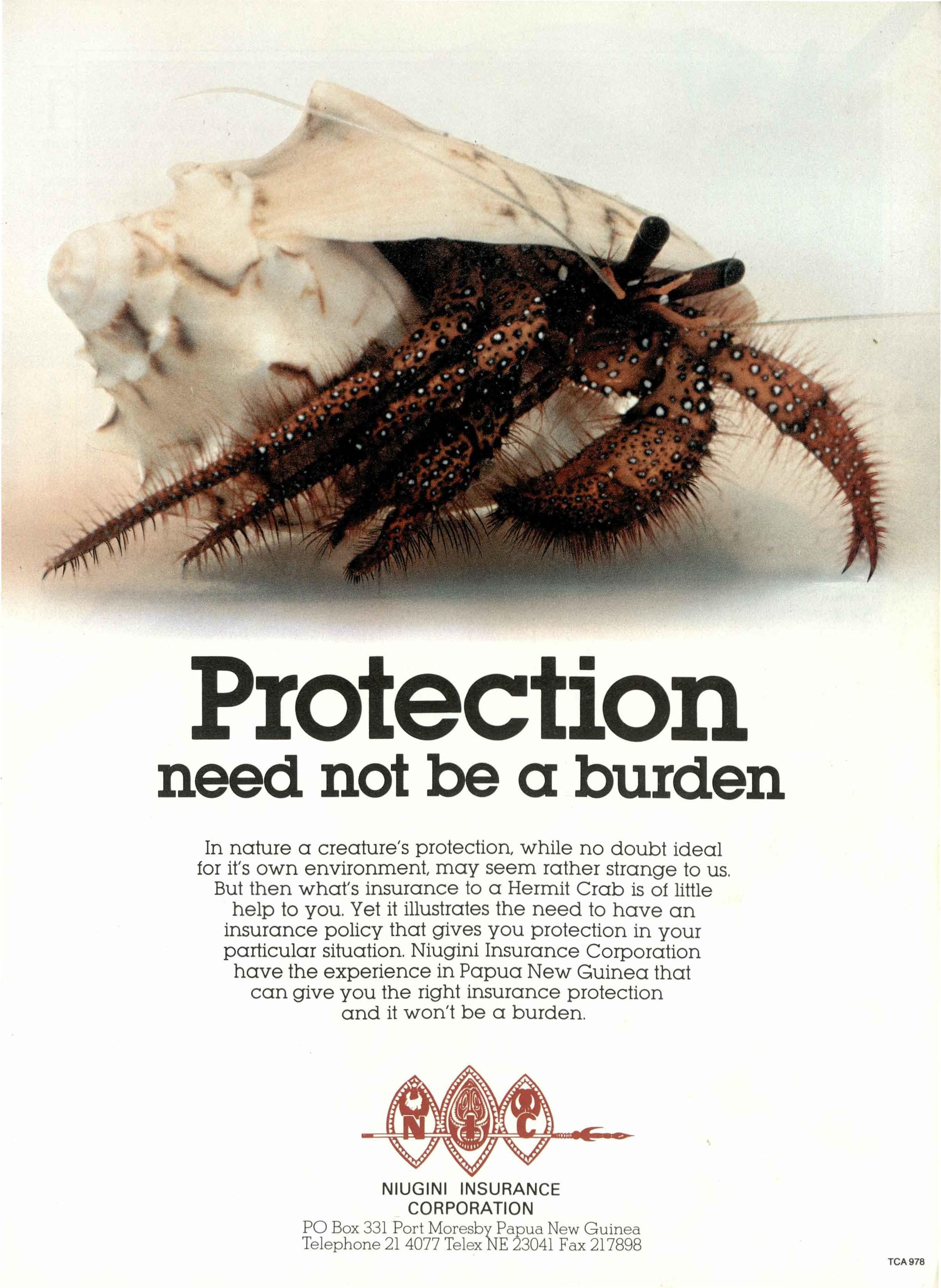 In nature a creature's protection, while no doubt ideal for it's own environment, may seem rather strange to us. But then what's insurance to a Hermit Crab is of little help to you. Yet it illustrates the need to have an insurance policy that gives you protection in your particular situation. Niugini Insurance Corporation have the experience in Papua New Guinea that can give you the right insurance protection and it won't be a burden.