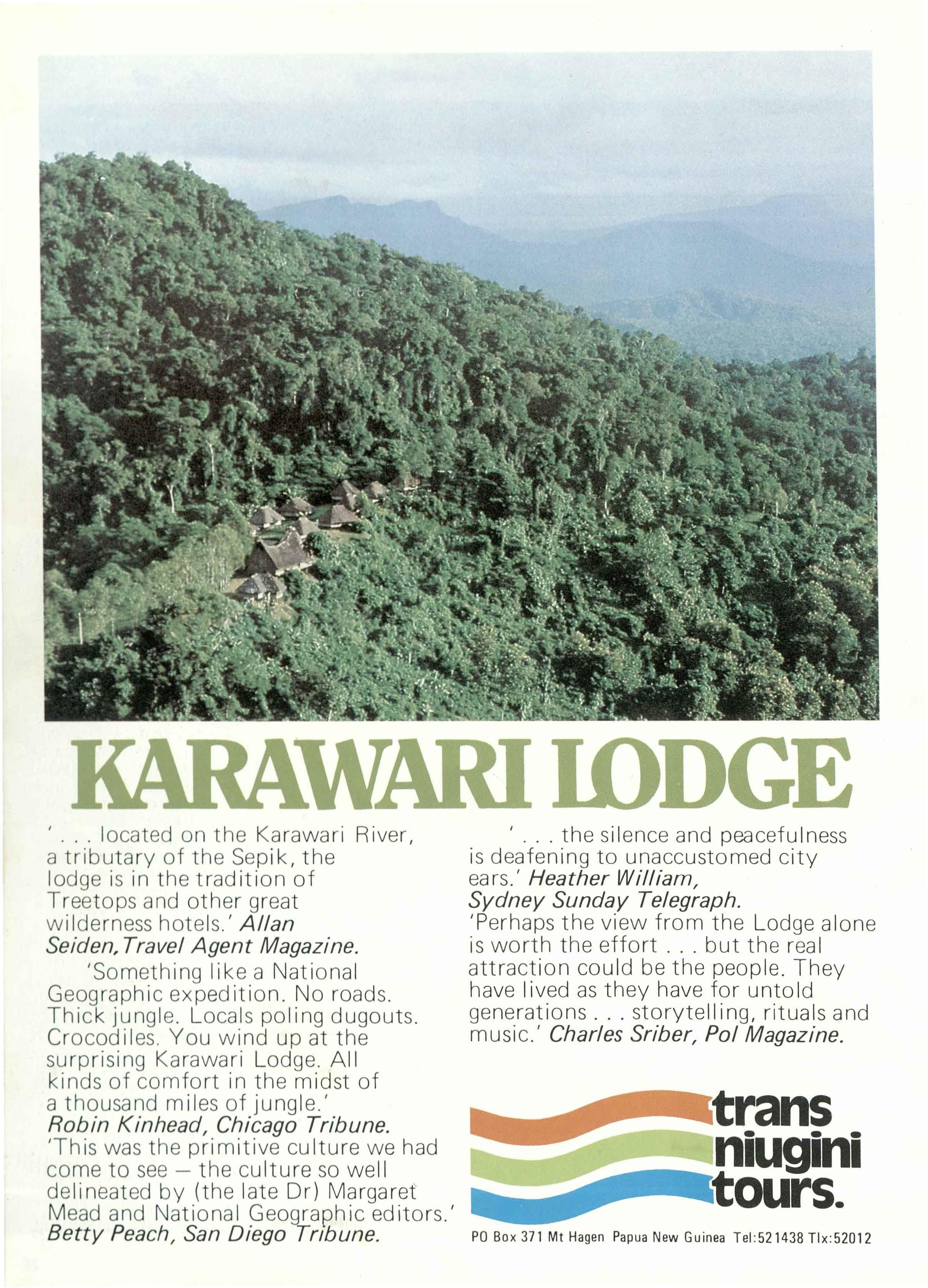 ' located on the Karawari River, a tributary of the Sepik, the lodge is in the tradition of Treetops and other great wilderness hotels.' Allan Seiden, Travel Agent Magazine.