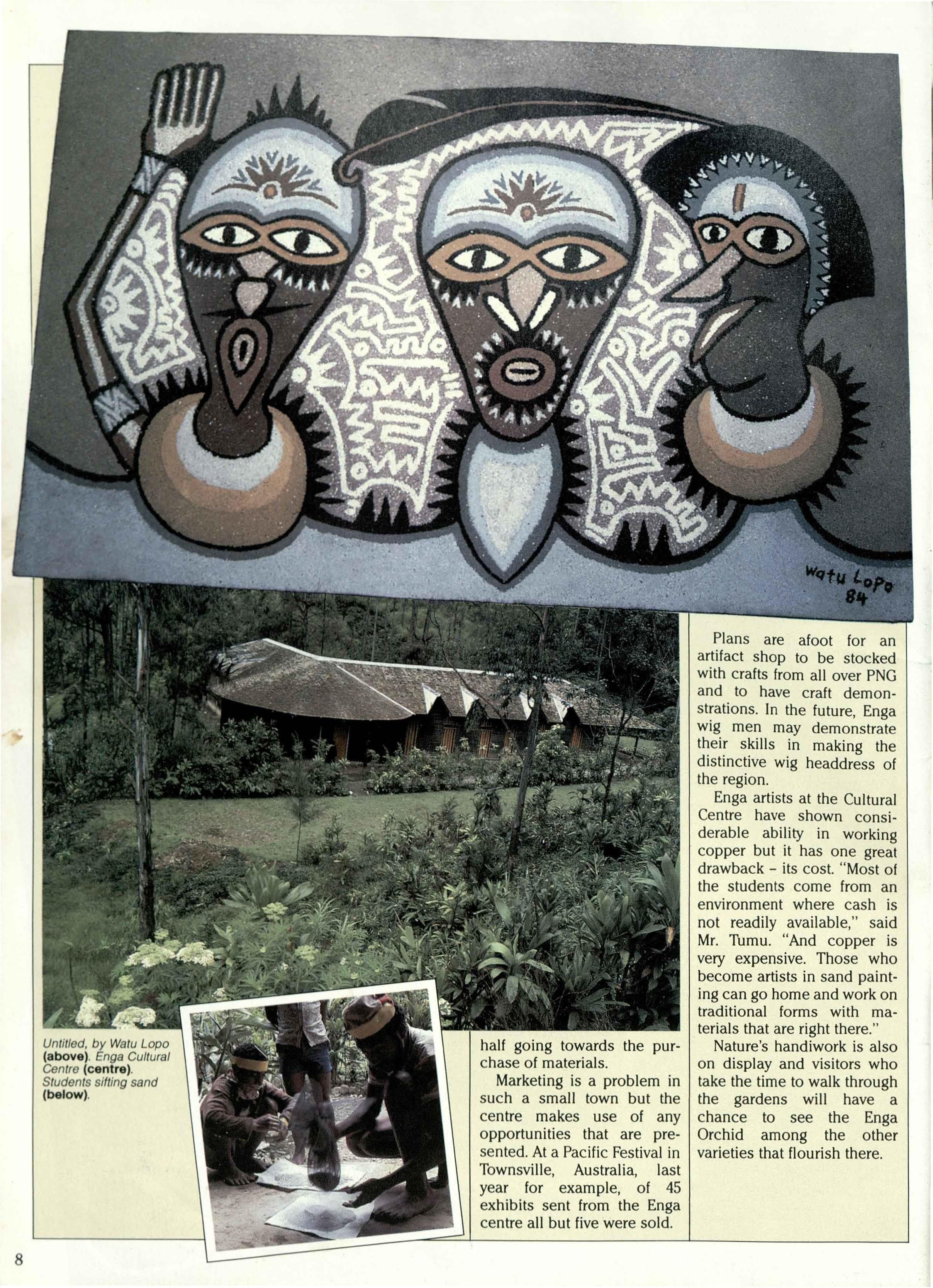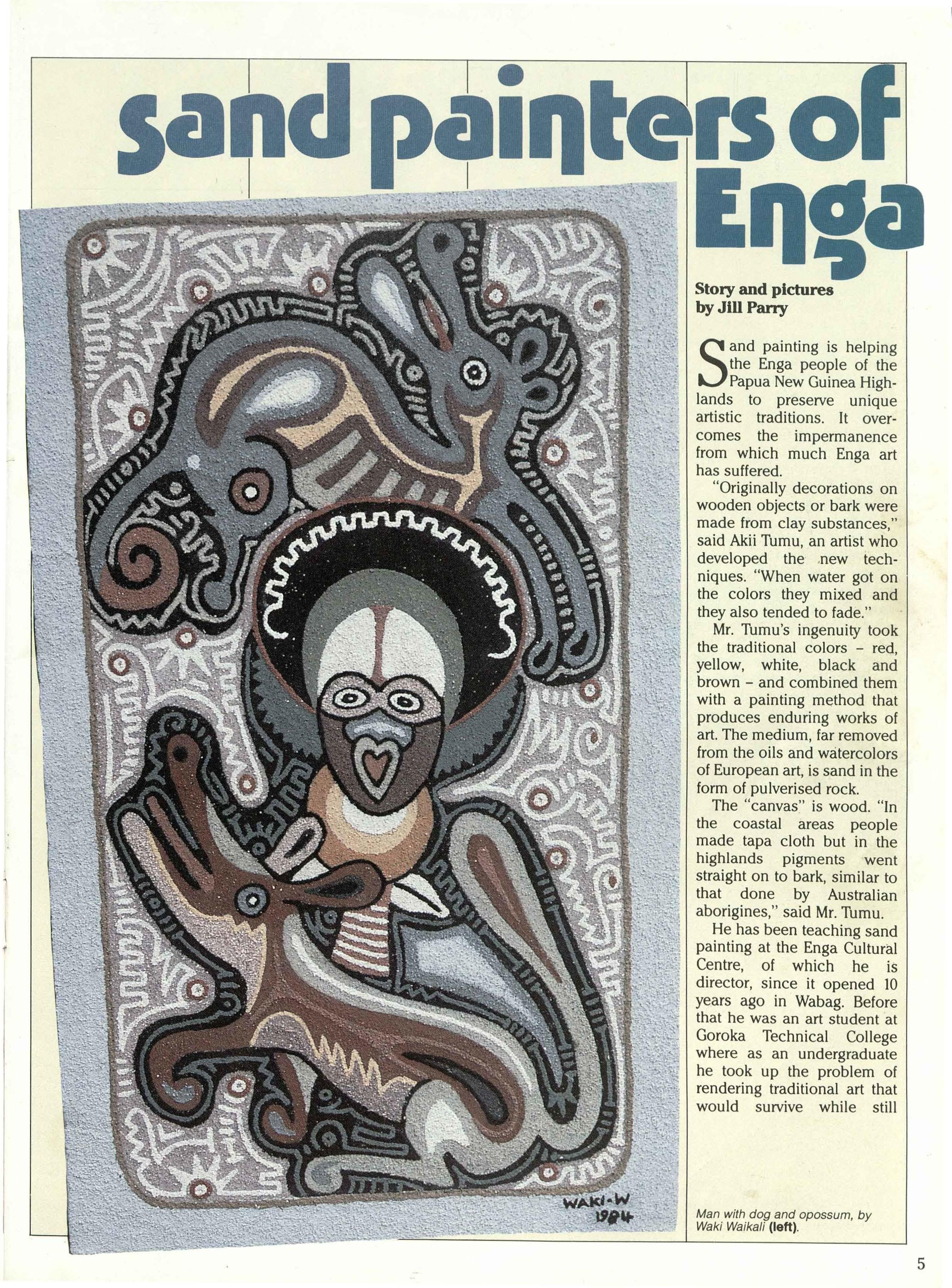 He has been teaching sand painting at the Enga Cultural Centre, of which he is director, since it opened 10 years ago in Wabag. Before that he was an art student at Goroka Technical College where as an undergraduate he took up the problem of rendering traditional art that would survive while still