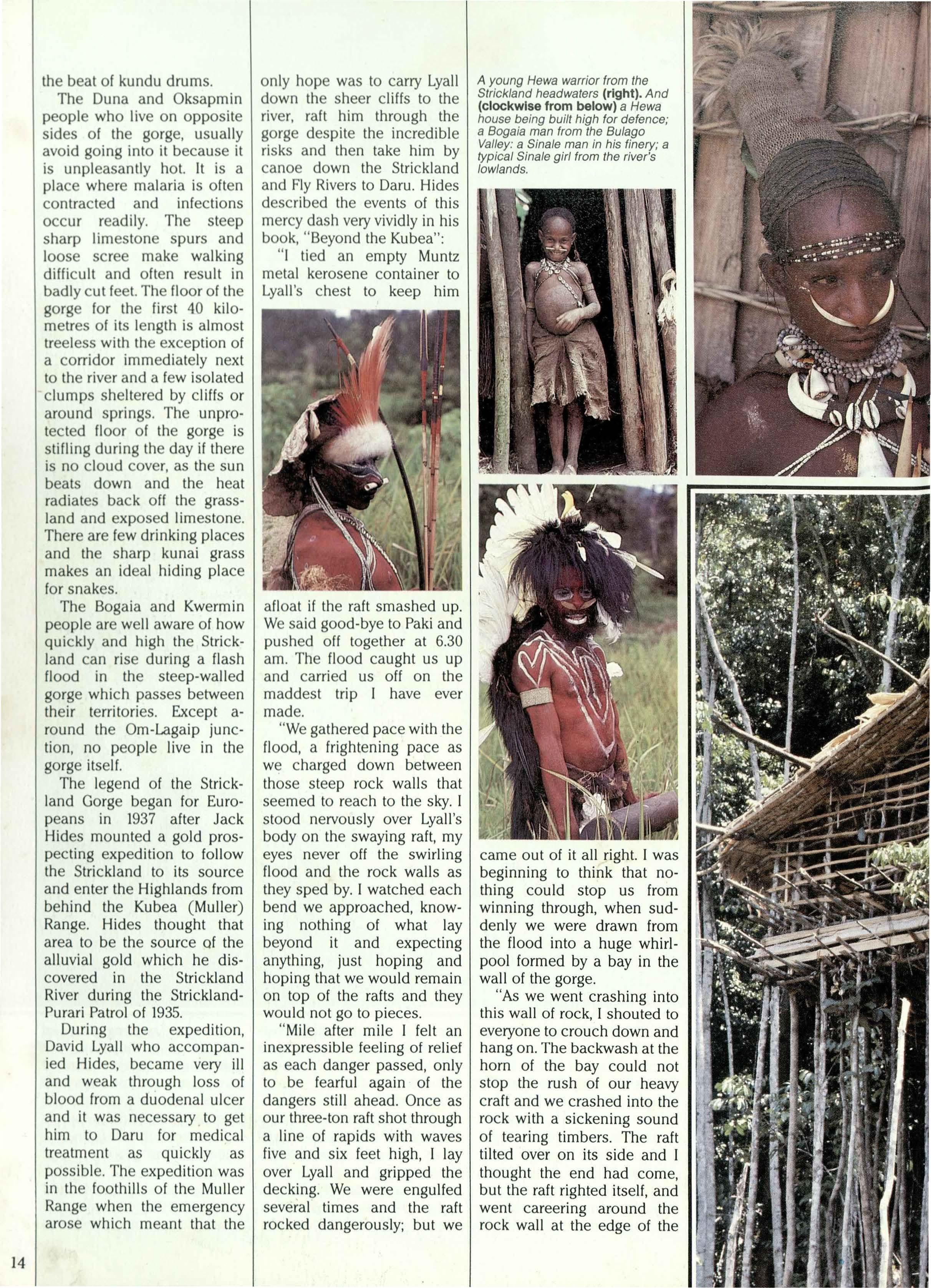 Th Bogaia and Kwermin peopl ar w II aware of how quickly and high the Strickland can rise during a flash flood in the steep-walled gorge which passes between their territories. Except around the Om-Lagaip junction, no people live in the gorge itself.