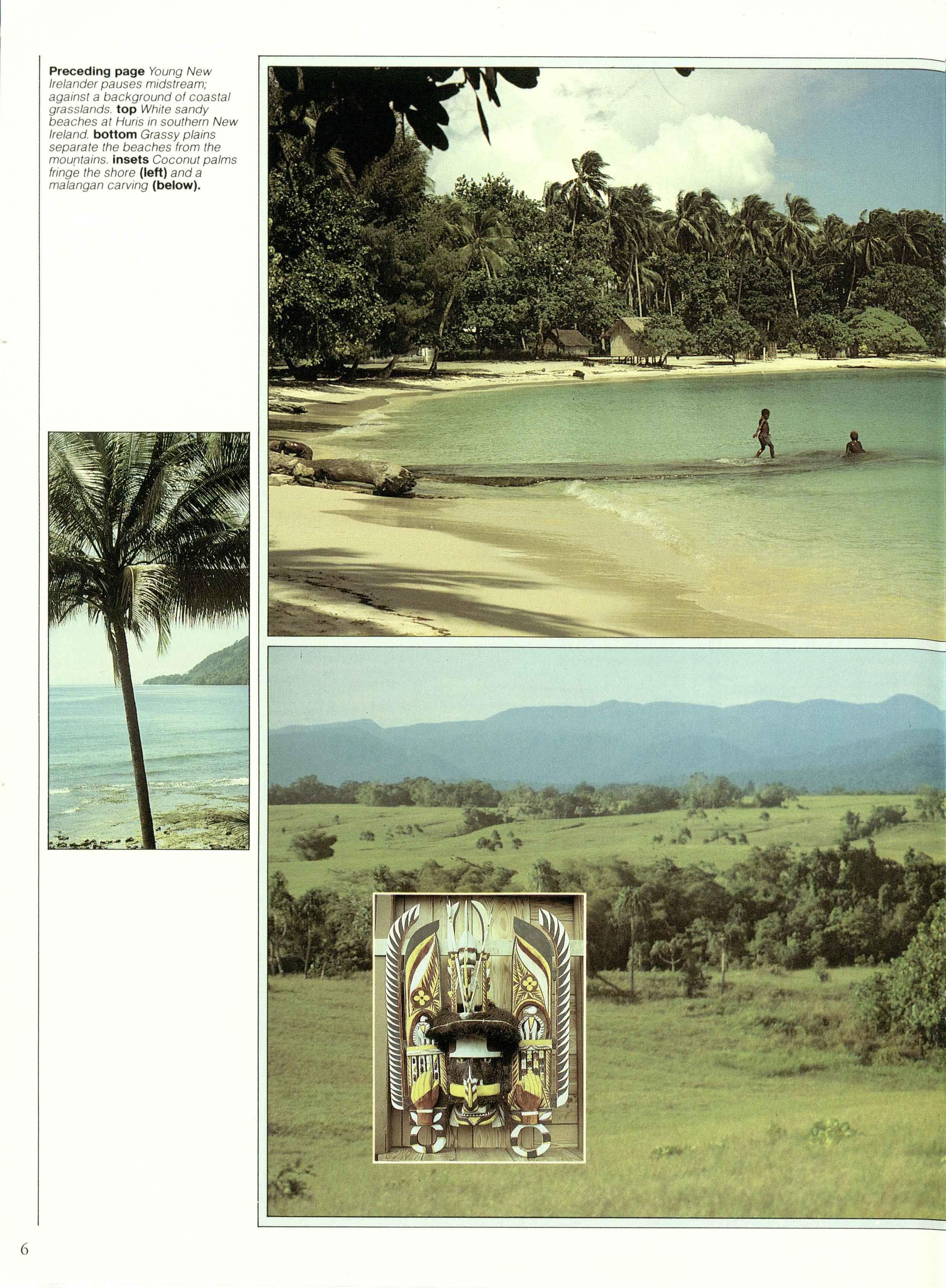 Preceding page Young New lrelander pauses midstream; against a background of coastal grasslands. top White sandy beaches at Huris in southern New Ireland. bottom Grassy plains separate the beaches from the mou()tains. insets Coconut palms fringe the shore (left) and a malangan carving (below).