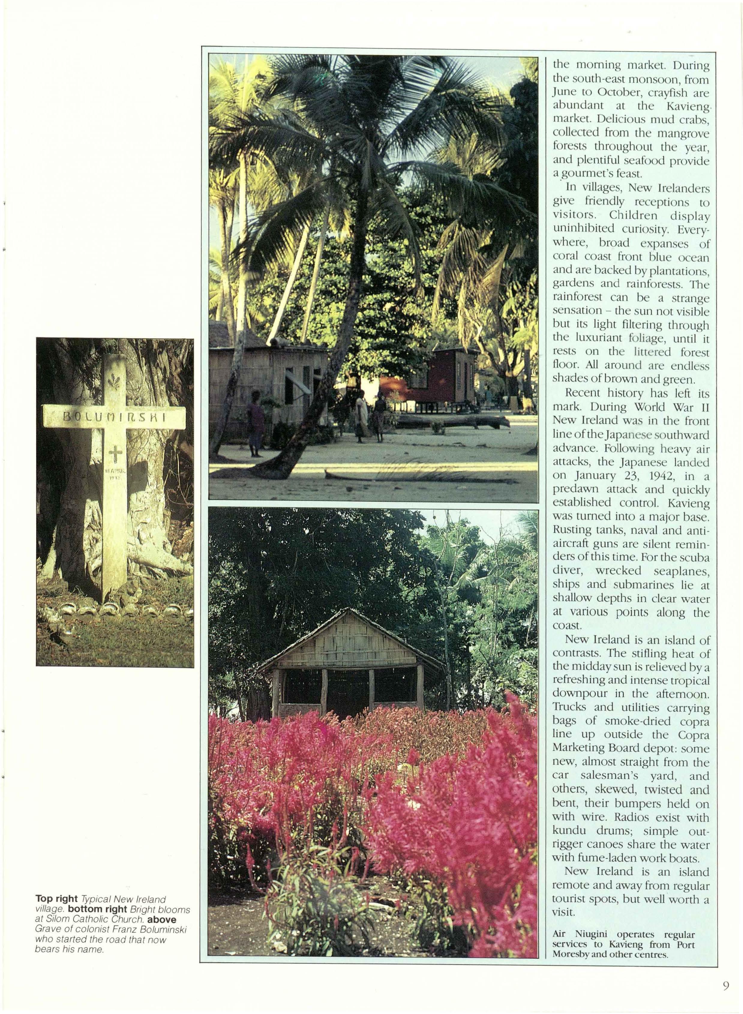New Ireland is an island of contrasts. The stifling heat of d1emidday sun is relieved bya refreshing and intense tropical downpour in the afternoon. Trucks and utilities carrying bags of smoke-dried copra line up outside the Copra Marketing Board depot: some new, almost straight from the car salesman's yard, and od1ers, skewed, twisted and bent, their bumpers held on wid1 wire. Radios exist with kundu drums; simple outrigger canoes share the water wid1 fume-laden work boats.