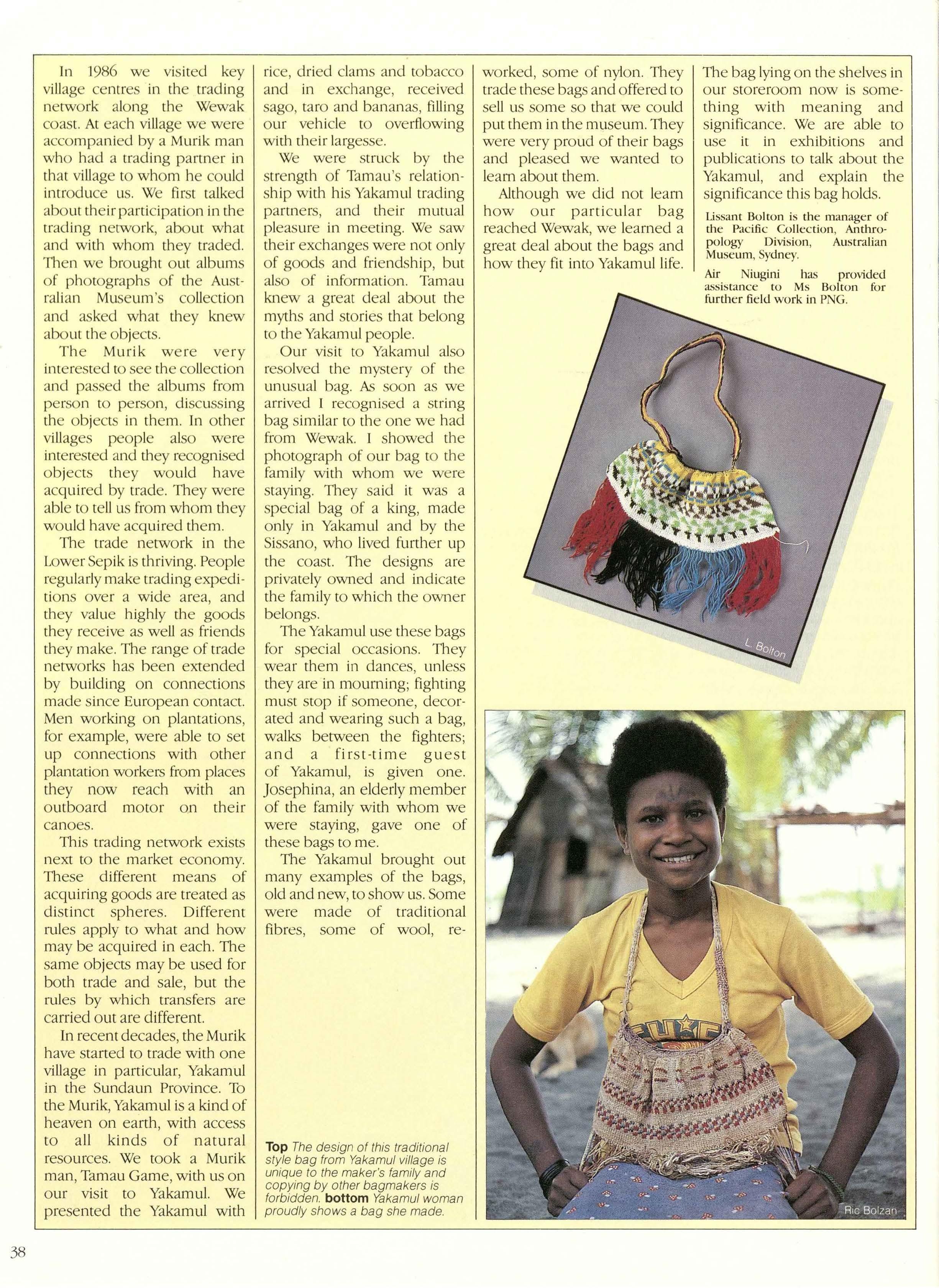 Top The design of this traditional style bag from Yakamuf village is unique to the maker's family and copying by other bagmakers is forbidden. bottom Yakamul woman proudly shows a bag she made.