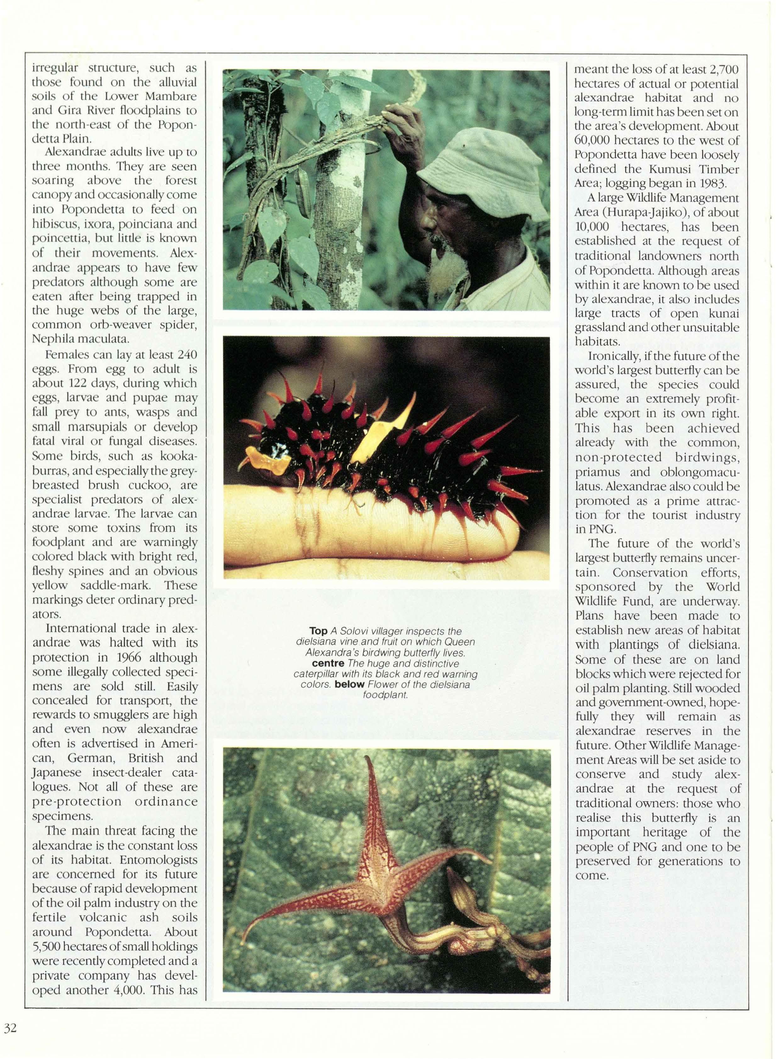 Alexandrae now ranks among PNG's most protected national animals which include other birdwing butterflies, birds of paradise and the sea mammal, the dugong. Of the nine species of Omithoptera aU but three are endemic to New Guinea, and are much sought after by colJectors because of their size, beauty and unavailability.