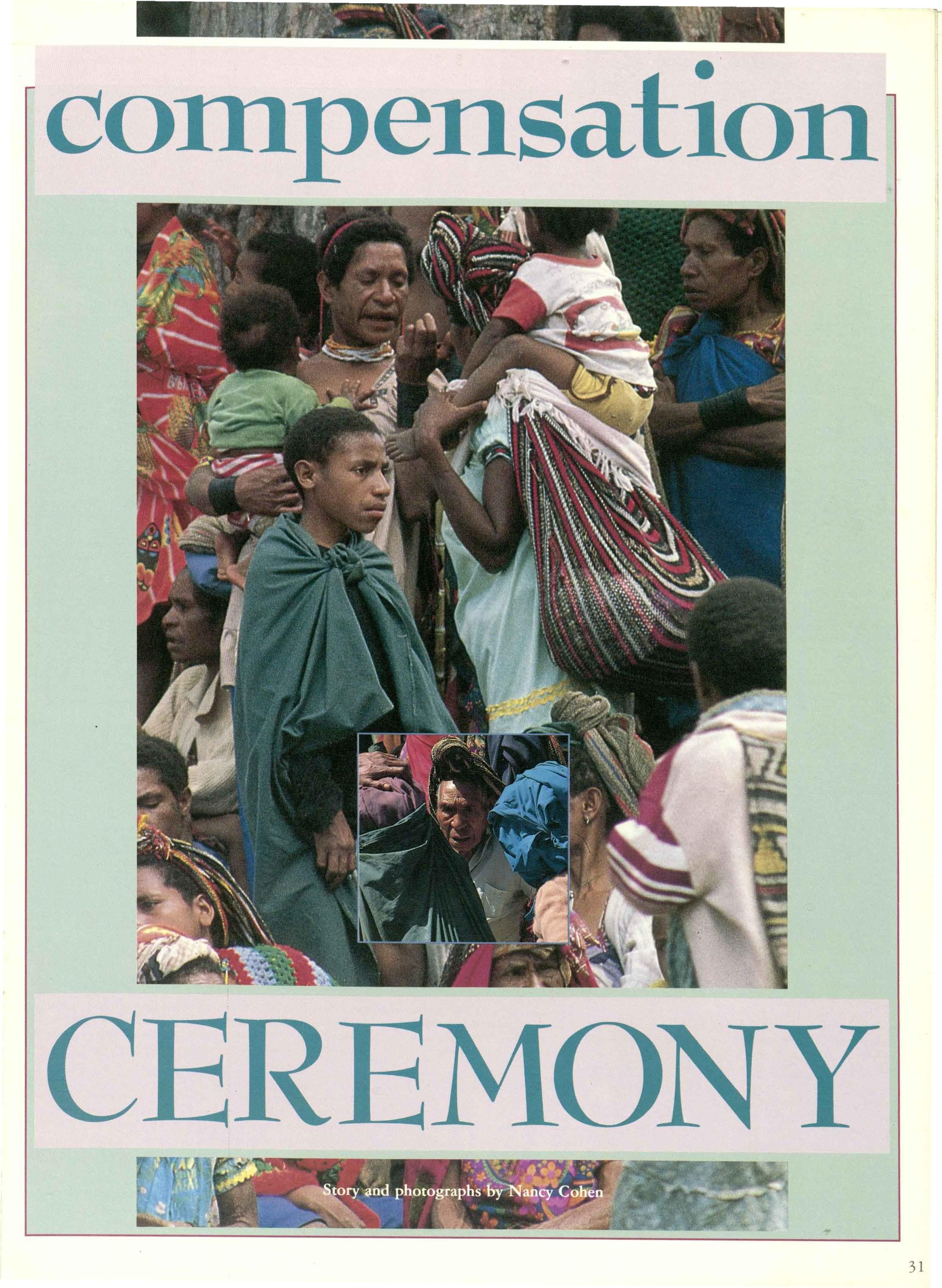 Compensation payments between Papua New Guinean tribal clans have been a way of life in resolving differences big and small over the years. These ceremonies result in the offending clan or group compensating the other group with anything from money to pigs to cuscus to birds to almost anything that could be considered currency. This month Nancy Cohen describes how she witnessed a recent ceremony.