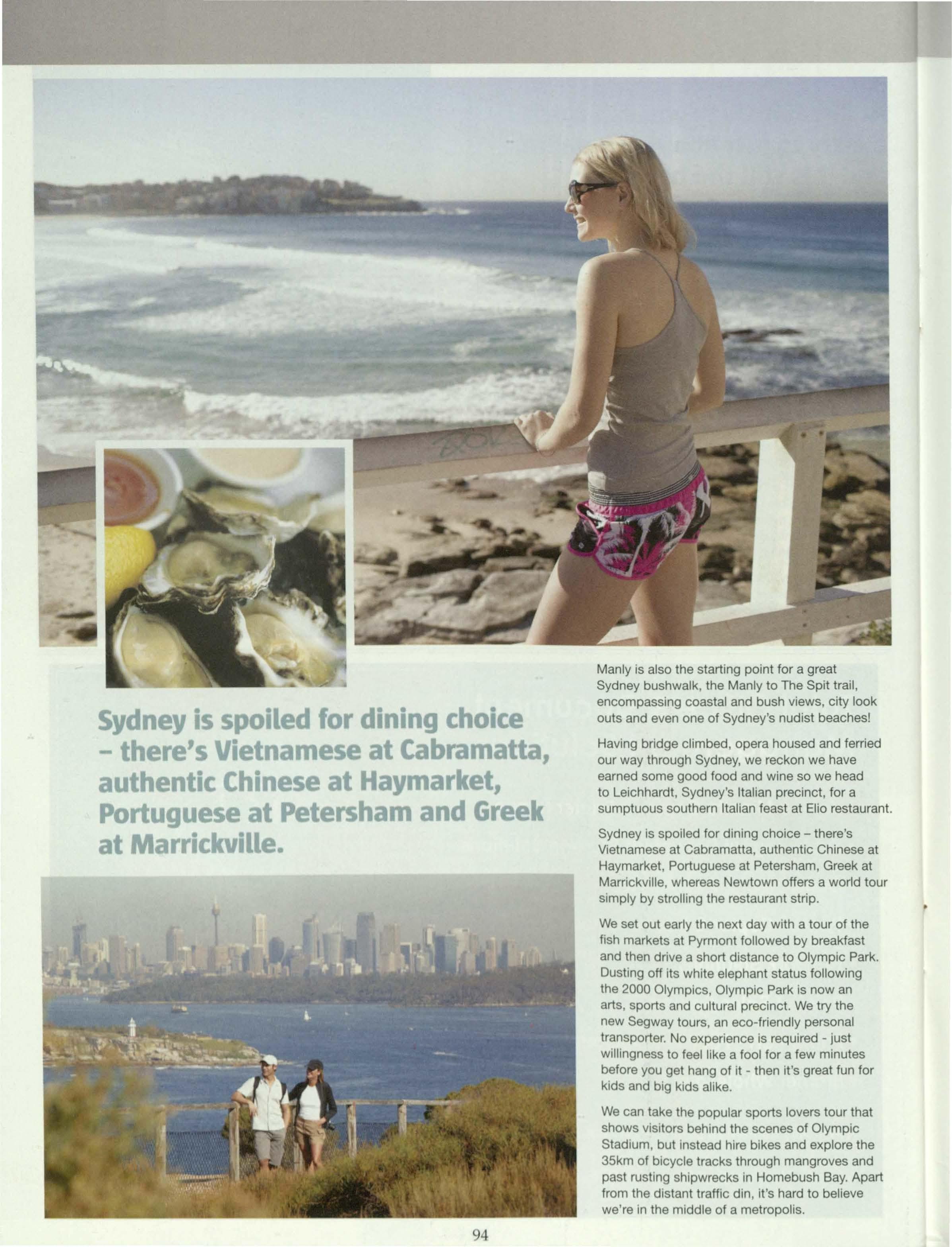 We set out early the next day with a tour of the fish markets at Pyrmont followed by breakfast and then drive a short distance to Olympic Park. Dusting off its white elephant status following the 2000 Olympics, Olympic Park is now an arts, sports and cultural precinct. We try the new Segway tours, an eco-friendly personal transporter. No experience is required - just willingness to feel like a fool for a few minutes before you get hang of it - then it's great fun for kids and big kids alike.