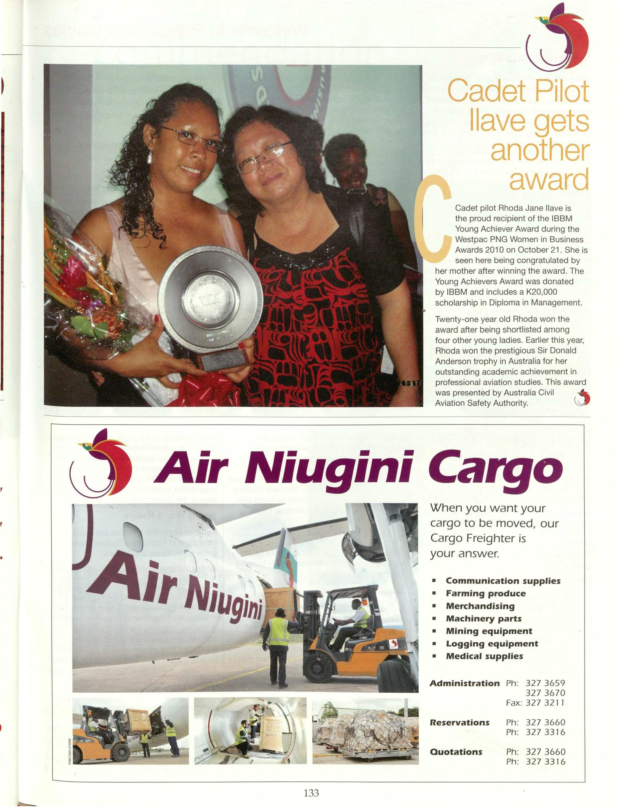 Cadet pilot Rhoda Jane llave is the proud recipient of the IBBM Young Achiever Award during the Westpac PNG Women in Business Awards 201 O on October 21. She is seen here being congratulated by her mother after winning the award. The Young Achievers Award was donated by IBBM and includes a K20,000 scholarship in Diploma in Management.