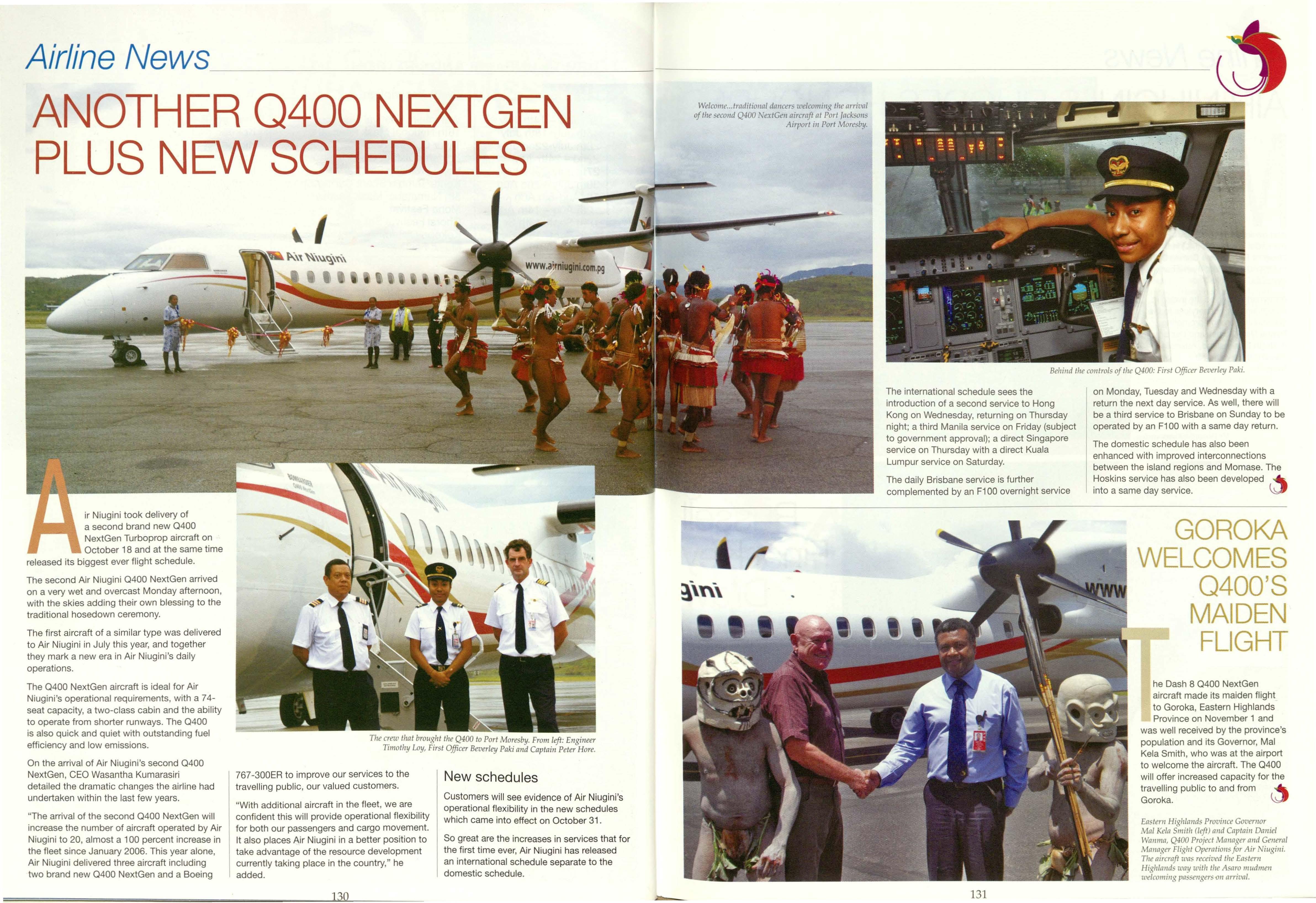 he Dash 8 0400 NextGen aircraft made its maiden flight to Goroka, Eastern Highlands Province on November 1 and was well received by the province's population and its Governor, Mai Kela Smith, who was at the airport to welcome the aircraft. The 0400 will offer increased capacity for the travelling public to and from Goroka. V