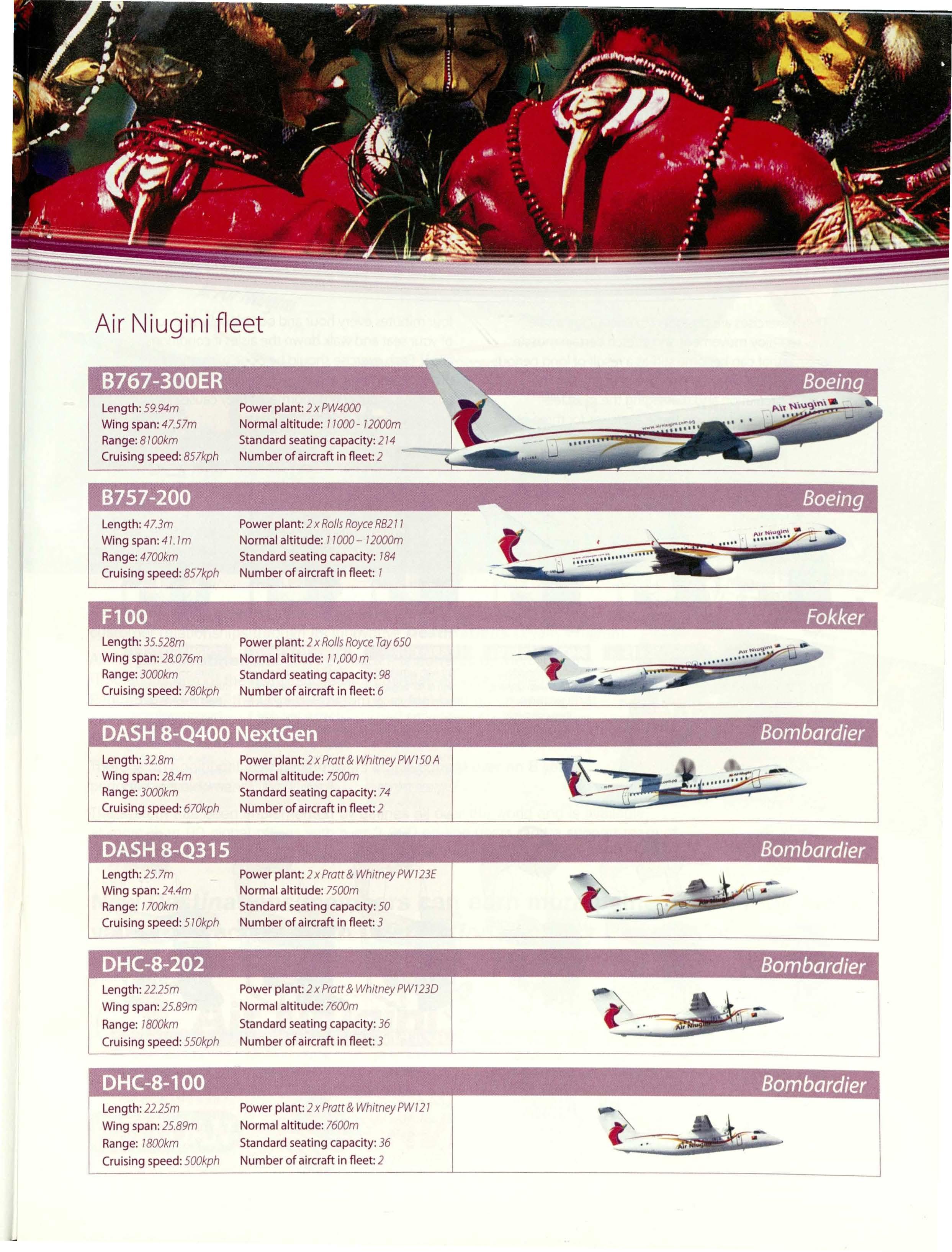 The 0400 NextGen aircraft is ideal for Air Niugini's operational requirements, with a 74seat capacity, a two-class cabin and the ability to operate from shorter runways. The 0400 is also quick and quiet with outstanding fuel efficiency and low emissions.