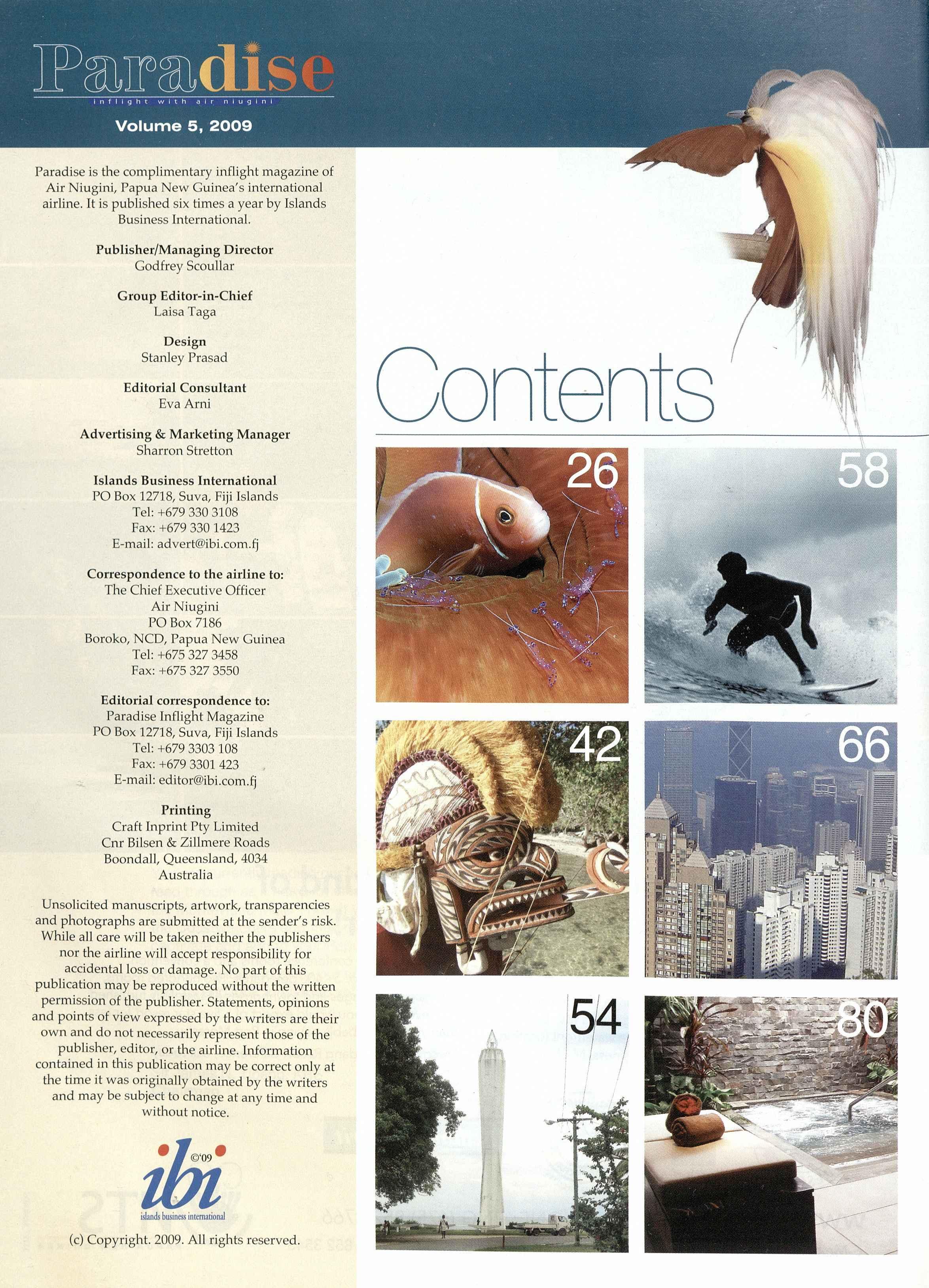 Vol 5 Sept 2009 of Paradise magazine, the inflight magazine of Air Niugini, the national airline of Papua New Guinea.