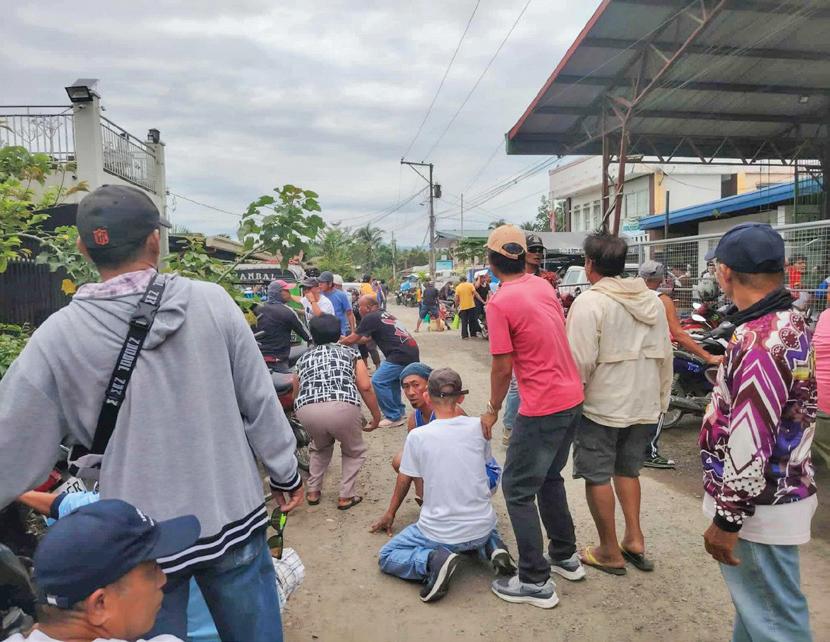 Tagum workers IN Tagum City, former banana workers holding their assembly to hear an update from the provincial Department of Agrarian Reform quickly rushed to the two exits of the gymnasium of Barangay San Isidro in Madaum. An elderly woman was seen crumpled to the cemented floor with some blood in her head, apparently after hitting the edge of the concrete bleacher. The rest ducked outside the gymnasium, many shouting for the intercession of God and Allah.