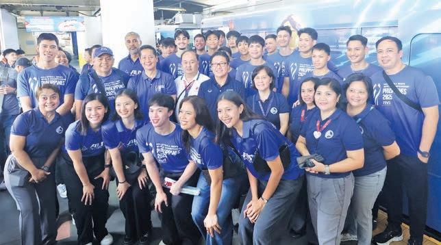 MEMBERS of Alas Pilipinas Men and Women along with PNVF president Ramon “Tats” Suzara, secretary-general Don Caringal and board member Yul Benosa and MRT3 General Manager Michael Capati pose before a fully dressed up MRT 3 train