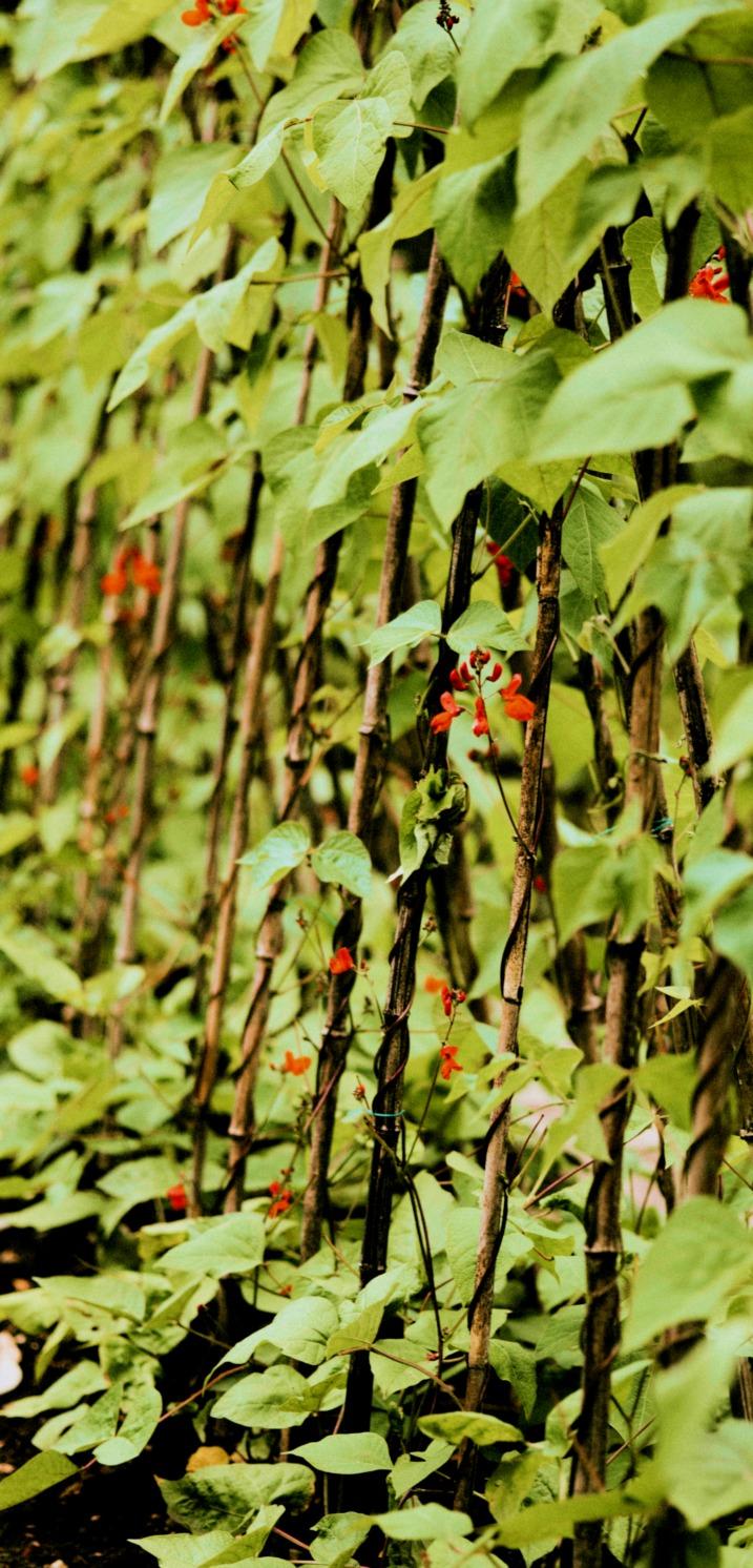 Plant stakes 7 or 8 feet high in the row where the beans are; set 2 or 3 stakes to the yard, and bend them over the top to form arches. In the spaces between the stakes, place pea sticks to which the runners may at first be trained. The stakes should also be tied together by wands arranged longitudinally, one along the top, and one halfway up each side. When this framework becomes covered with scarlet runners, a very pleasant shady walk will be formed.