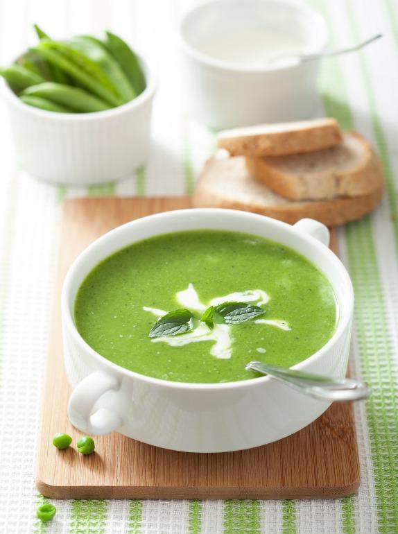 ● Stir in the peas, bring to the boil again, then cook for about 3 mins until they are just done. Remove the pan from the heat, add the mint leaves and whizz in a blender or food processor until smooth.