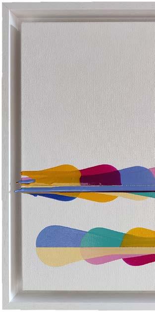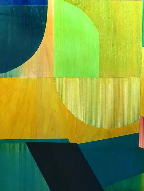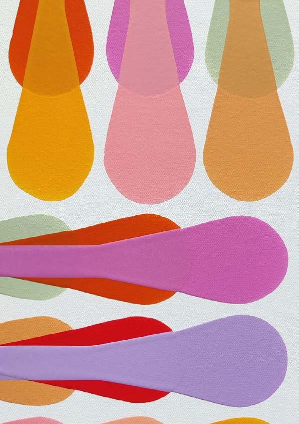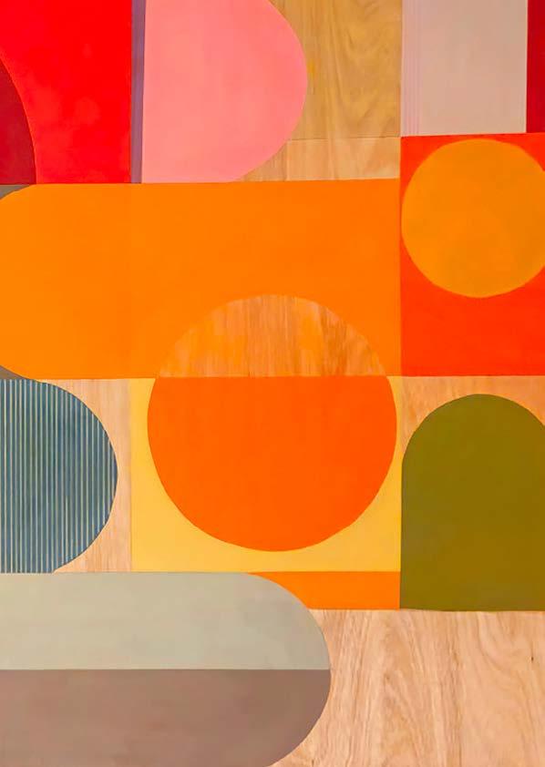 At the start of Sally Burch’s life as a painter she fought against her graphic roots, but now fully embraces those skills and influences to stir the “paint pot” with ever evolving ideas from her fine art education. Her art practice is influenced by natural landscapes and phenomena that she personally experiences via both physical and virtual media. Working with sketches and digital media, she builds up a catalogue of simplified references, motifs and colours that she converts into her own pictorial language of pattern, form and pigment.