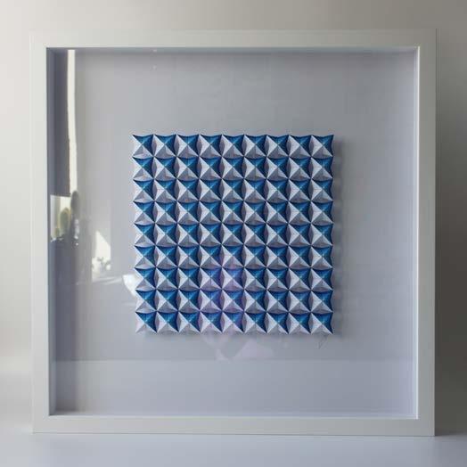 Emily V Jones’s vivid artworks explore geometry and colour, manipulating the viewers interpretation of shape with her unique folding technique, deployed across a range of mediums to create one off, 3D contemporary. Jones demonstrated her creative flair from an early age - initially studying art and photography at school where she found herself continually drawn to paper as a medium, captivated by the versatility it offered to sculptural structures.